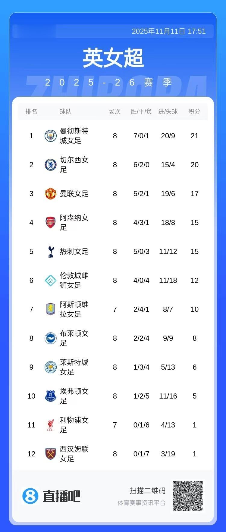 曼城女足积21分领跑,切尔西女足以1分之差紧随其后,曼联女足17分排在第3,阿森纳女足15分暂居第4。