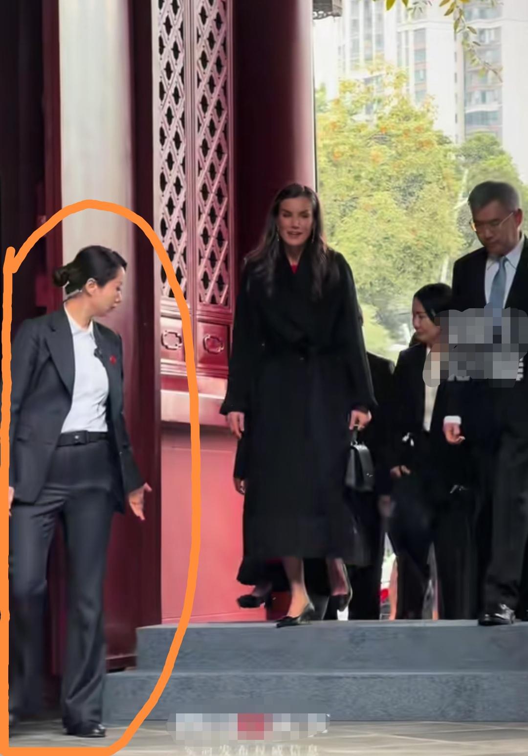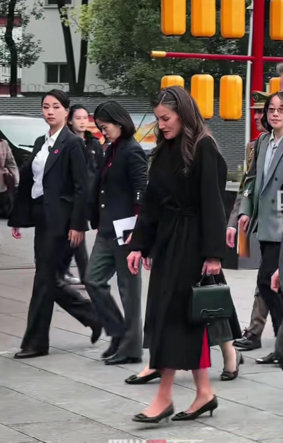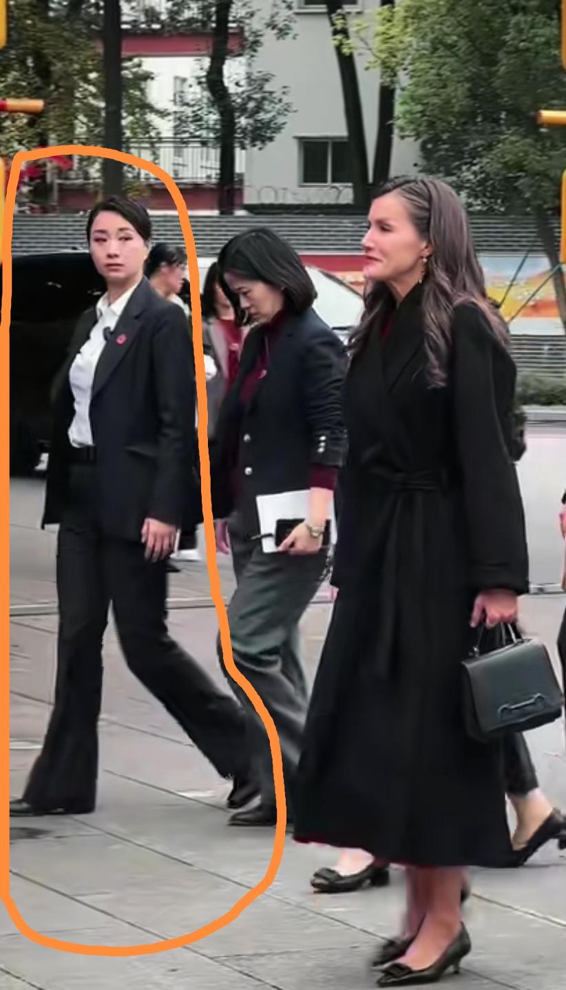11月11日,西班牙王后在四川游逛了,有相关工作人员陪同,有一位穿白色衬衫身材高挑的女保镖伴随左右。 这位女保镖工作人员穿着低跟黑色皮鞋、黑色西装、白色衬衫,看起来很干练,绑着丸子头,时刻注意观察周围情况,在王后进入景区下台阶的时候,她细心的做出动作让王后注意安全。 王后穿的也很优雅,穿着黑色高跟鞋,红色连衣裙,外搭黑色大衣,一头秀发提着黑色小包衬托了高贵的气质。