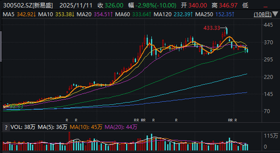 然而,就在新易盛发布靓丽的三季报后,公司股价却迎来快速回调,在近日击穿60日均线后继续走弱,于11月10日最低探至322.75元,区间市值最大蒸发达1099.13亿元。