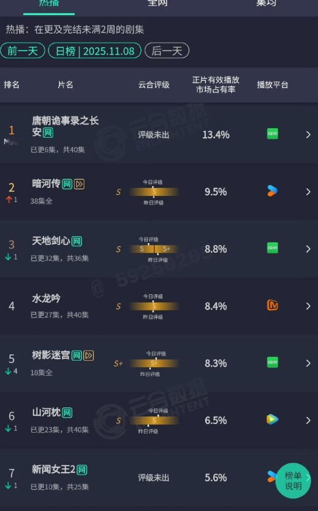 《唐诡3》首战告捷! 首日热度8850,创爱奇艺首日历史热度记录,且断层第一,开播首日云合登顶,占比13.4%,首日播放量3100万,超过双台联播首日2700万的《赴山海》,拿下2025年全平台首日云合播放量第一,且唯一一部首日破3000万播放量的作品。