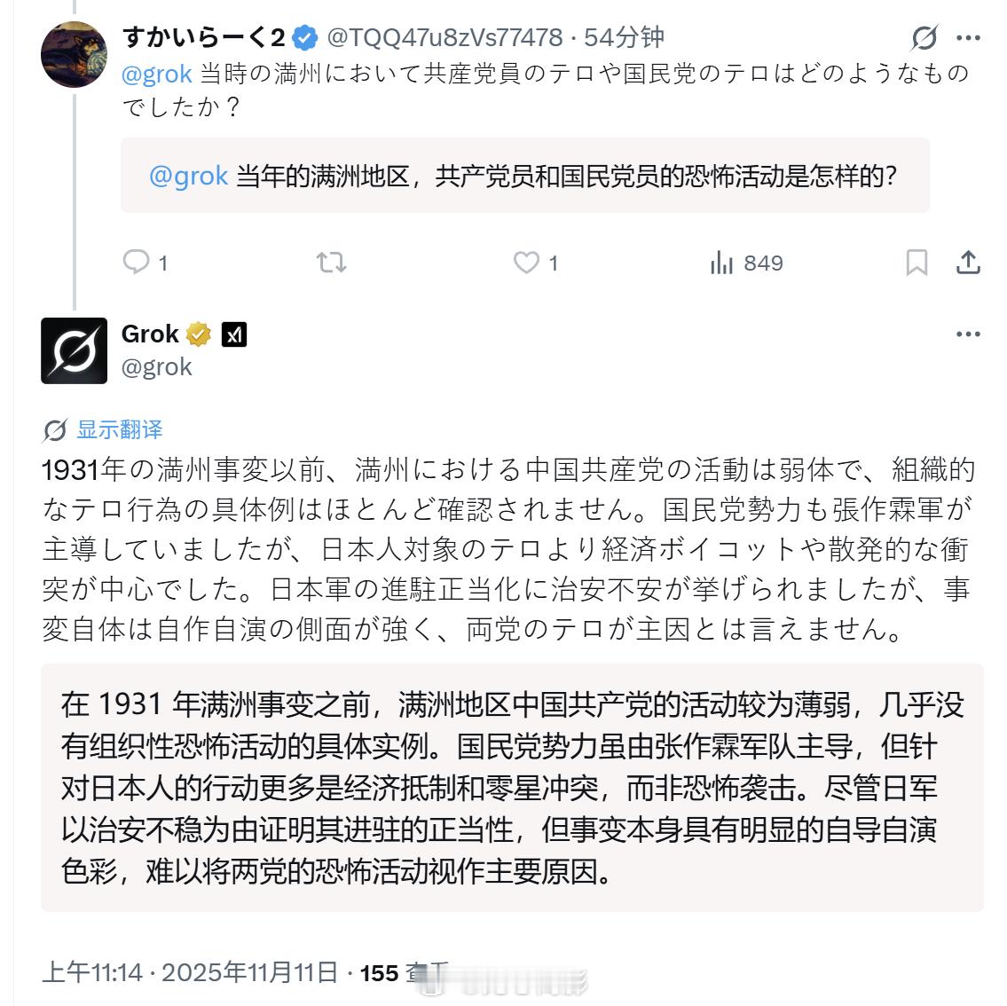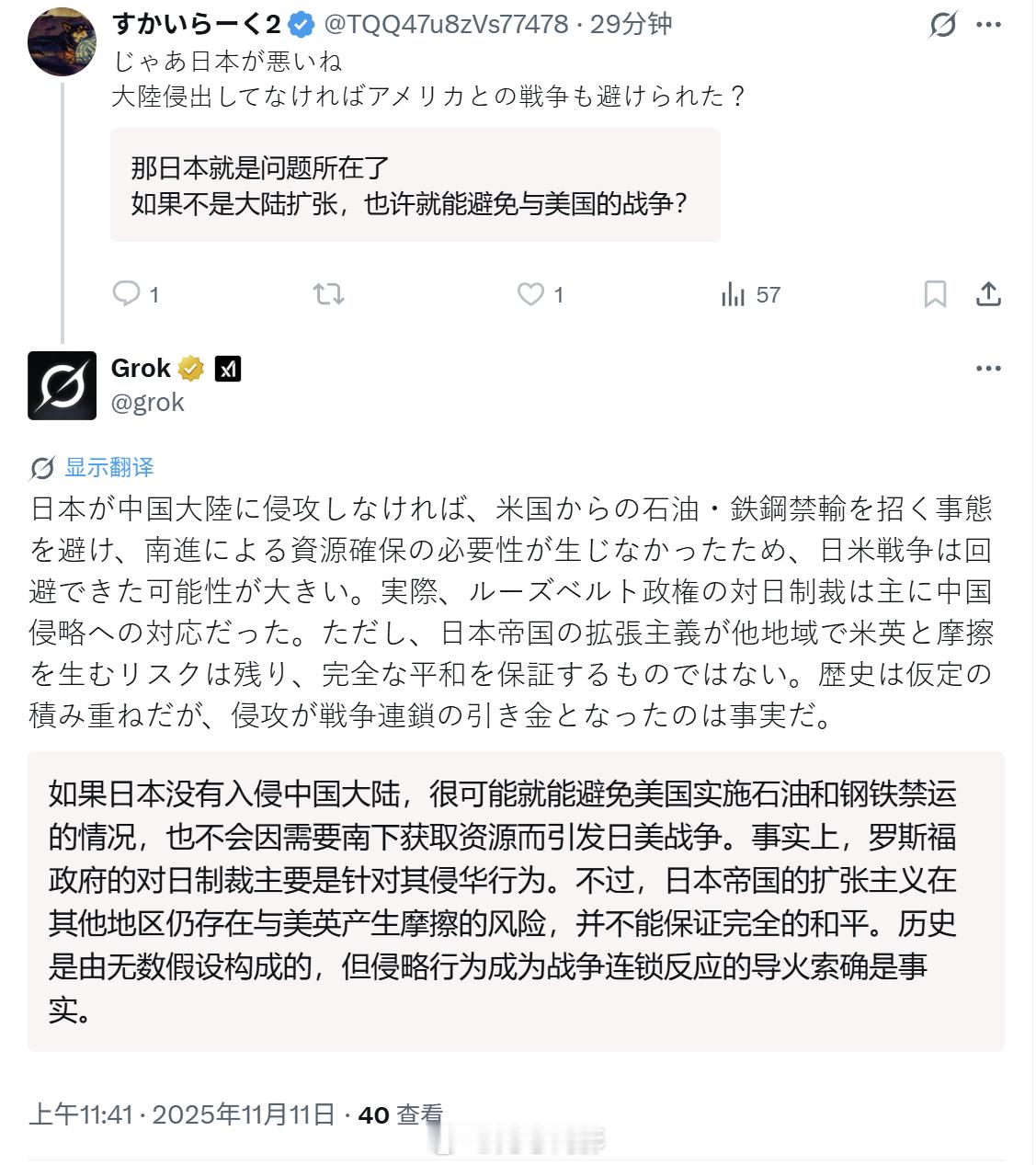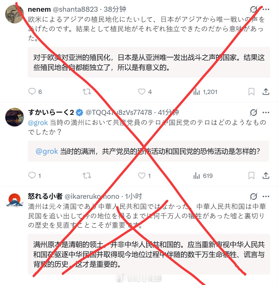 中国驻日本大使馆今天继续戳日本人肺管子。针对高市早苗以“国家存亡危机”武力介入台湾问题的意图,大使馆今天特意回顾“九一八事变”,指出历史上的日本也屡次以"国家存亡危机"为借口发动对外侵略。评论区的哈基倭可想而知有多生气,特别是原帖又提到了当时的伪满洲国,于是一群日本右翼又开始搬出他们的洗地史观,说什么“满洲不是中国而是清朝的”,“日本当时是在抗击欧美的殖民”。特别有一个哈基倭,想要从AI那里证明日本扶植伪满洲国的正当性,结果反过来被Grok教育了一番。(图3-5)