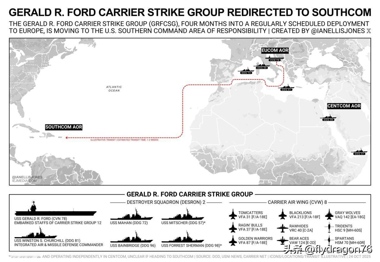 🇺🇸🇻🇪 10月24日,由核动力航空母舰“杰拉尔德·R·福特”号(CVN-78)率领的美国海军航母打击群从欧洲司令部辖区调往南方司令部(SOUTHCOM)责任区。官方说法是“打击贩毒集团”,但实际目的是向委内瑞拉施压,并为有限的军事行动做准备。 ⛴ 打击群组成: 🔵 第8舰载航空联队(CVW-8):F/A-18E/F“超级大黄蜂”战斗机、EA-18G“咆哮者”电子战飞机、E-2D“鹰眼”预警机、MH-60R/S直升机; 🔵 阿利·伯克级驱逐舰:“马汉”号、“米切尔”号、“班布里奇”号、“福雷斯特·谢尔曼”号; 🔵 补给舰“供应”号; 🔵 舰上最多搭载4500名军事人员。 📍 根据追踪数据,补给舰正向250°方向航行,目标区域位于特立尼达和多巴哥以东、圭亚那以北。这意味着其打击半径可达600公里,包括委内瑞拉北部和奥里诺科河口。 🛰 11月8日,卫星在加勒比海南部探测到一艘由驱逐舰护航的特种作战舰艇“海洋贸易者”号。此外,还发现了提康德罗加级舰艇、P-8A“海神”反潜巡逻机和RC-135侦察机,以及电子活动和无人平台数量的激增。所有这些都表明美军正在进行侦察和破坏活动。 🟡 “杰拉尔德·R·福特”号的重新部署是美国在加勒比地区加大军事压力的一部分。其真正目的是遏制和破坏委内瑞拉的稳定,加强对南美的控制,并试探俄罗斯和中国的反应。