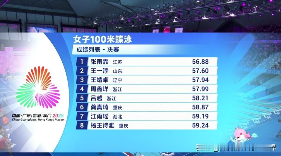 56秒88!不出所料,全运会游泳比赛女子百米蝶泳再次被老将张雨霏轻松折冠。中国女子百米蝶泳的新人们要加油哦! 在刚刚结束的第十五届全运会女子100米蝶泳决赛中。江苏队名将张雨霏以领先第二名0.72的绝对优势再次赢得冠军,成绩是56秒88。亚军被山东队的王一淳获得,成绩是57秒60。第三名被辽宁队的王靖卓获得,成绩是57秒94。 在本届全运会女子100米蝶泳预赛中,张雨霏的成绩并不理想,只以58秒84的成绩排名第四。不过,随着比赛的进程的进程的深入,她的竞技状态越来越好。在半决赛中,她游出了57秒22的好成绩。在今晚的决赛中,她再接再厉,成绩再上一层楼。成为了八名选手中唯一突破57秒大关的运动员。除此之外,她还将参加女子4×100米自由泳接力、女子4×200米自由泳接力、女子4×100米混合泳接力、男女4×100米混合泳接力等多项接力比赛,希望我们的“中国蝶后”在今后的比赛中获得更多的金牌。