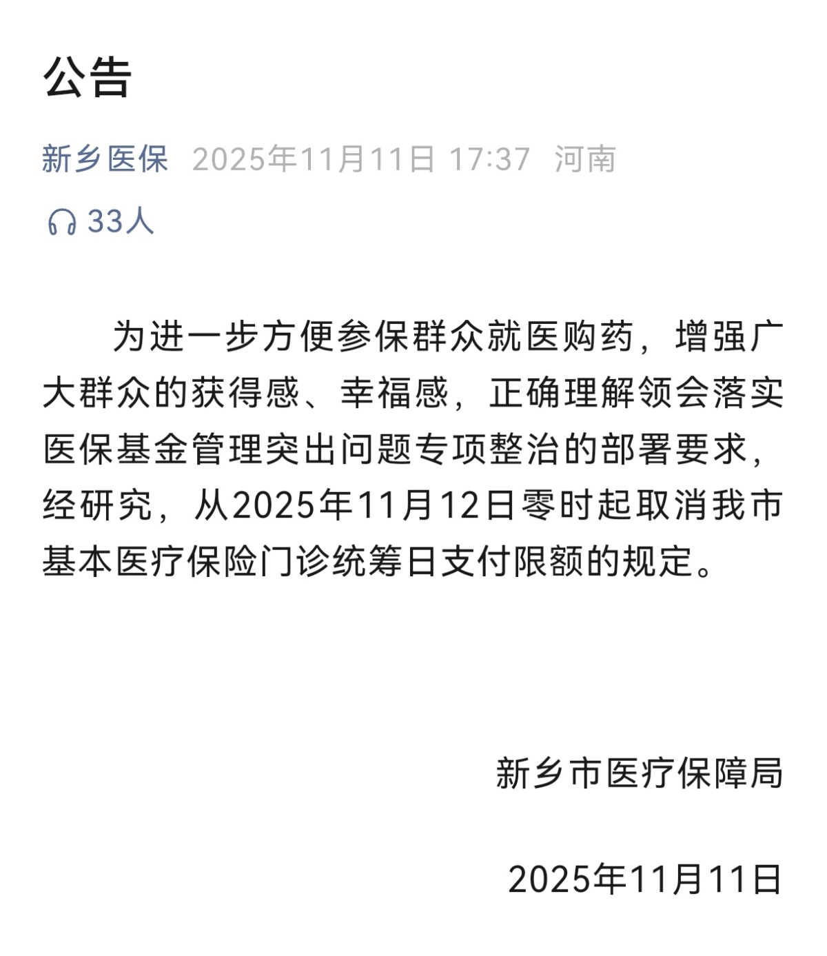 连日来引发广泛关注的新乡市医保门诊统筹日支付限额争议,有了明确解决方案。11月11日17时许,新乡市医疗保障局通过官方微信公众号发布公告,宣布自2025年11月12日零时起,正式取消该市基本医疗保险门诊统筹日支付限额规定,切实方便参保群众就医购药,增强市民医保获得感与幸福感。