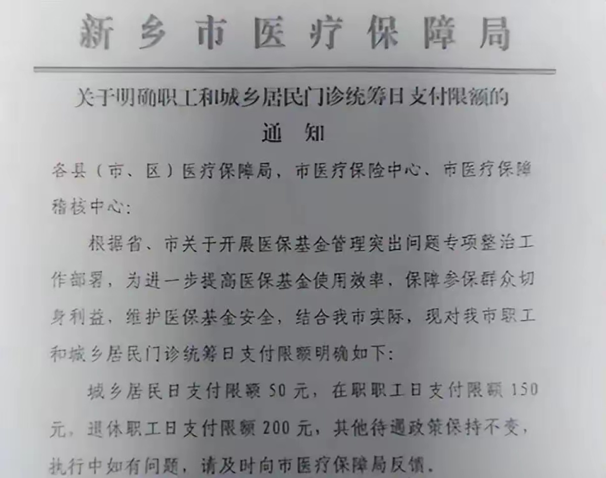 此次政策调整源于一则引发热议的限额通知。近日,有新乡市民在就诊时发现,当地医院张贴的公告显示,根据市医保局2025年6月13日发布的相关文件,城乡居民医保门诊统筹日支付限额50元,在职职工150元,退休职工200元。这一规定迅速引发社会关注,不少网友反映,普通感冒购药费用就可能超出居民医保50元的日限额,若需购买大额慢性病药品,限额政策更会带来诸多不便。