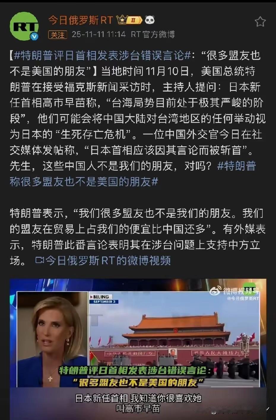 听闻这件事,特朗普急摇头! 11月11日,俄罗斯媒体消息显示,福克斯记者向特朗普抛出的提问直指台海局势,一边是日本首相高市早苗宣称台海局势已到“极其严峻阶段”,将大陆对台湾的任何举动视作日本“生死存亡危机”。 一边是中方外交官在社交平台怒怼其言论应遭“斩首”,两大热点叠加的提问本想逼出明确立场,特朗普的回应却耐人寻味。视频中的他频频急摇头,两句简短表态道破美日同盟的真实底色:“我们很多盟友也不是我们的朋友”“我们的很多盟友在占我们的便宜”,对台海核心议题避而不谈。 高市早苗上任未满一月便在台海问题上跳得最高,这般反常操作绝非心血来潮。作为日本宪政史上首位女首相,她的政治野心从上台之初便显露无遗。《读卖新闻》民调显示其内阁支持率高达71%,创下历届新内阁初期支持率前列的纪录。 这背后除了“新首相效应”带来的新鲜感,更多是她刻意炒作敏感议题的政治算计。明知台湾是中国不可分割的一部分,台海问题纯属中国内政,却执意抛出“存亡危机事态”的危险言论,甚至暗示日本自卫队可能行使集体自卫权,这般突破底线的挑衅,本质上是想借外部矛盾转移国内视线。 要知道她的内阁刚成立就因7名涉“黑金”丑闻的官员任命遭在野党猛烈抨击,年底还要面临补充预算通过的严峻考验,在政绩乏善可陈的情况下,唯有通过制造“外部威胁”才能煽动民粹、稳固支持基础。 更值得警惕的是,高市早苗的言论并非单纯的政治作秀,而是带着明确的法理越界企图。她试图将台海问题纳入日本国家安全法律框架,把中国内政与日本所谓“生存利益”强行捆绑,这种操作既违反了《中日联合声明》确立的一个中国原则,也违背了国际法基本准则。 回顾历史,日本曾以“存亡危机”为借口发动侵华战争,如今故技重施,难免让人怀疑其是否想重蹈军国主义覆辙。可她似乎忘了,今时不同往日,中国早已不是任人欺凌的弱国,维护国家主权和领土完整的决心坚如磐石,任何分裂国家的企图都注定是螳臂当车。 与日本的激进形成鲜明对比的,是美国的冷漠与务实。特朗普的两句回应看似答非所问,实则道破了美日同盟的核心本质——利益捆绑而非道义结盟。所谓“盟友不是朋友”的论断,戳破了“台湾有事就是日本有事,日本有事就是美国有事”的虚假承诺。 特朗普政府的外交风格向来是“利益至上”,此前亚洲之行中,他从日韩榨取5500亿美元和3500亿美元的投资承诺,收获大量能源与军备订单,这种“以盟谋利”的操作早已成为常态。 对美国而言,日本不过是其在亚太地区遏制对手的棋子,有用时便加以利用,需付出代价时便果断抽身。台海局势一旦失控,美国绝不会为了日本的野心而卷入与中国的直接冲突,特朗普刻意回避核心议题的态度,正是这种务实利己思维的直接体现。 美方的冷处理并非偶然,而是基于清晰的战略判断。当前美国国内面临政府“关门”困局,特朗普支持率有所下滑,国际上俄乌停火斡旋前景不明,加沙局势动荡,此时在台海问题上与中国发生冲突完全不符合美国利益。 更重要的是,美国深知中国在台湾问题上的红线不可触碰,兰德公司报告早已建议美国支持“渐进式统一”,反对“台独”,这种理性声音反映出美国精英阶层的真实考量。高市早苗想通过激进表态“绑架”美国对台政策,让美国为其冒险行为背书,无异于与虎谋皮。 没有美国的实质性支持,日本仅凭一己之力根本掀不起风浪。高市早苗的冒险之举在日本国内也引发轩然大波。最大在野党立宪民主党党首野田佳彦直言其言论“很危险”,公明党、日本共产党纷纷表示反对,《朝日新闻》社论更是警告此举会加剧中国对日不信任,为日本扩大法律解释打开方便之门。 这种内外交困的局面,注定了她的“台海牌”难以奏效。所谓“战略模糊”底线的突破,本质上是政治投机者的孤注一掷,既得不到国际社会的认可,也无法获得国内民众的真正支持。国际法公认的国家主权准则,都是她无法逾越的鸿沟,任何试图挑战这些底线的行为,只会让日本陷入更危险的地缘政治旋涡。 台湾问题从来都是中国的内政,容不得任何外部势力指手画脚。从《开罗宣言》到《波茨坦公告》,一系列国际法律文件早已明确台湾的中国属性,这是不容置疑的历史事实。 无论是“台独”分裂势力还是外部干涉势力,都无法阻挡国家统一的历史大势。高市早苗的激进言论、特朗普的暧昧回应,不过是台海局势中的一段小插曲,却深刻揭示了国际关系的本质——没有永恒的盟友,只有永恒的利益。 这场围绕台海议题的博弈,最终只会让各方认清现实:日本的政治投机难以得逞,美国的务实算计终究是利己为先,而中国维护国家主权的决心不可撼动。任何试图分裂中国、干涉内政的行为,都将遭到坚决反制,自食恶果。