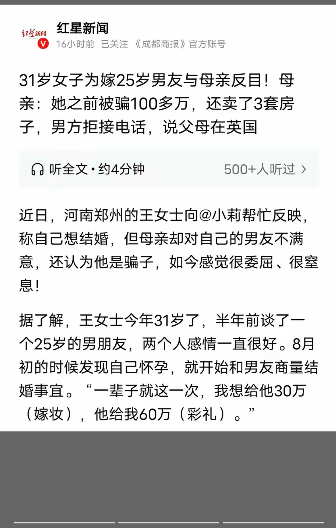 31岁嫁25岁,这年龄差没问题,但这事儿就离谱。河南郑州这女子,为跟男友结婚和父母反目成仇,在家又是互殴,又是用剪刀砸门、摔古董。她父母崩溃啊,她刚被骗100万、卖了3套房。她还打算给男友30万嫁妆,等对方给60万彩礼。父母就想先见男孩家人,可连男方家在哪都不知道,说在英国,电话也拒接。恋爱3个月,她跟家里要30多万买车,结果车和钱都没了。父母担心是“杀猪盘”,她倒好,父母不支持就打算一人去英国找男友,真让人着急!