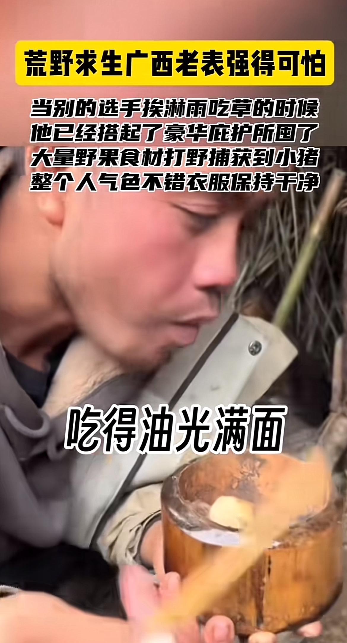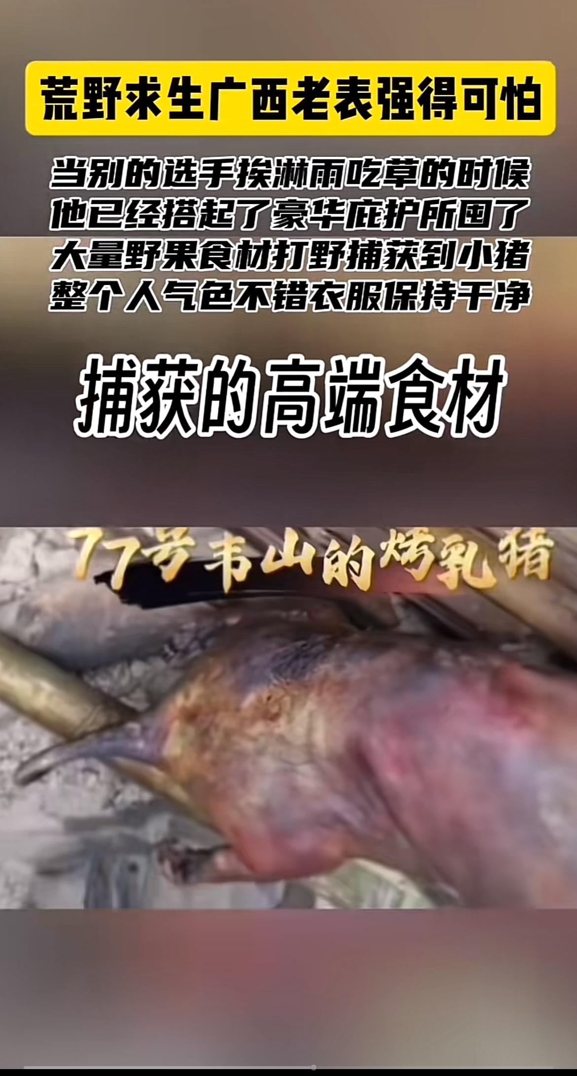 最近,广西老表的荒野求生视频火爆网络。别的求生者饿得饥肠辘辘,只能栖身于破棚之中,这位老表却好似在野外定居一般自在。 他一进入山林,就仿佛自带“生存加成”。用树枝、藤蔓和树叶搭建出带有“屋顶”“门框”“屋檐”的庇护所,还有通风口和观察位,周围再用石头垒起“院墙”,宛如一座“野外小别墅”。寻找食物对他来说也轻而易举,野菜、野果、菌类随手可得,自制的陷阱还能捕获兔子和鸟。生火烤肉时,那香味四溢。 更有趣的是,他竟和小猪在野外过上了温馨的生活,这样的场景恐怕很多农村人都未曾见过。不得不说,这位广西老表的野外求生技能实在是太厉害了!