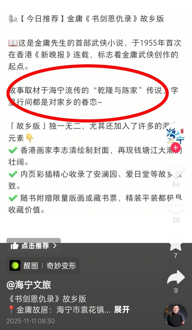 大皖新闻记者还注意到,近期,海宁文化旅游发展中心在官方账号中也多次通过发布视频或文章,提及这一传说。例如,11月11日,该中心在某短视频平台推荐金庸《书剑恩仇录》时,提到故事取材于在海宁流传的“乾隆与陈家”传说,评论区同样有网民议论纷纷。在另一条视频评论区,官方账号还留言,提醒大家理性讨论。