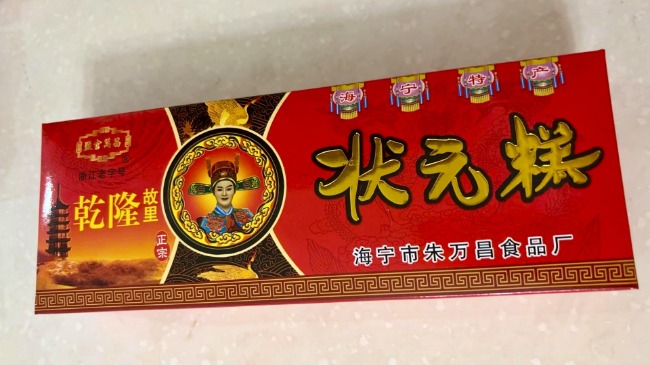 大皖新闻记者注意到,这款糕点名为状元糕,外包装信息显示,生产厂家为海宁市朱万昌食品厂,也是浙江老字号,并明确标注了“乾隆故里”“海宁特产”等字样。