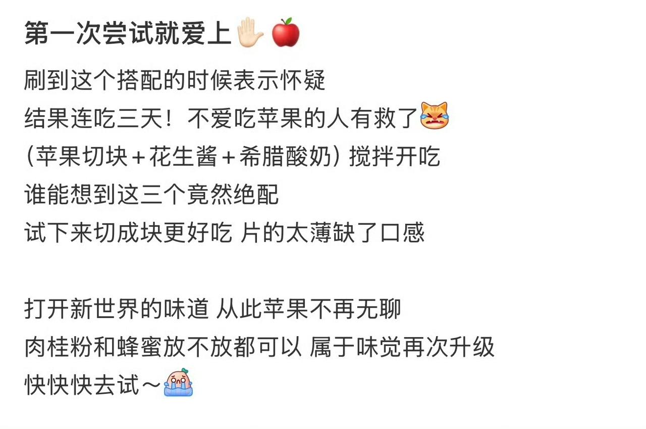 陈震:不爱吃苹果的人有救了! 不爱吃苹果不吃不就完了吗?又不是必须吃……[允悲][允悲] 发现网上起标题还挺吸引人的,原来搞了半天是苹果的新吃法,对于不爱吃苹果的这种水果的人来说,吃不吃没有任何的区别。 发现网友还真开发出来了多种吃法,就是为了改善苹果的口感。各位是怎么看的?欢迎评论区留言。
