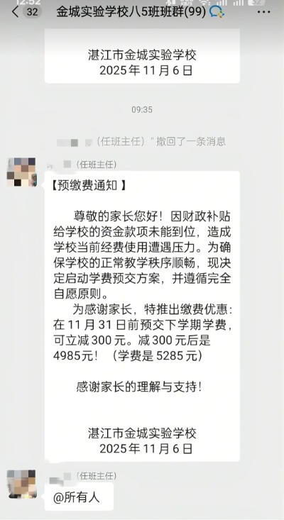 大皖新闻讯“因财政补贴给学校的资金款项未能到位,造成学校当前经费使用遭遇压力。为确保学校的正常教学秩序顺畅,现决定启动学费预交方案……”11月11日,一则落款为广东湛江市金城实验学校的通知在网上流传开来,引发热议。对此,市教育局回应称,辖区教育局已介入处理。