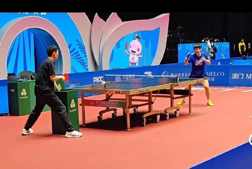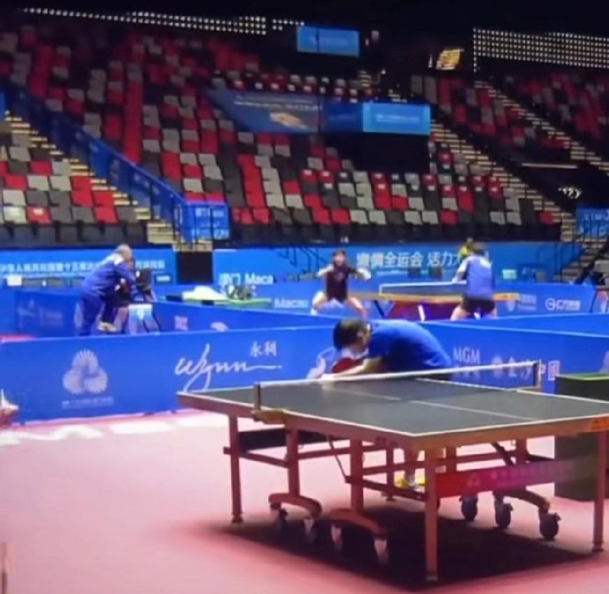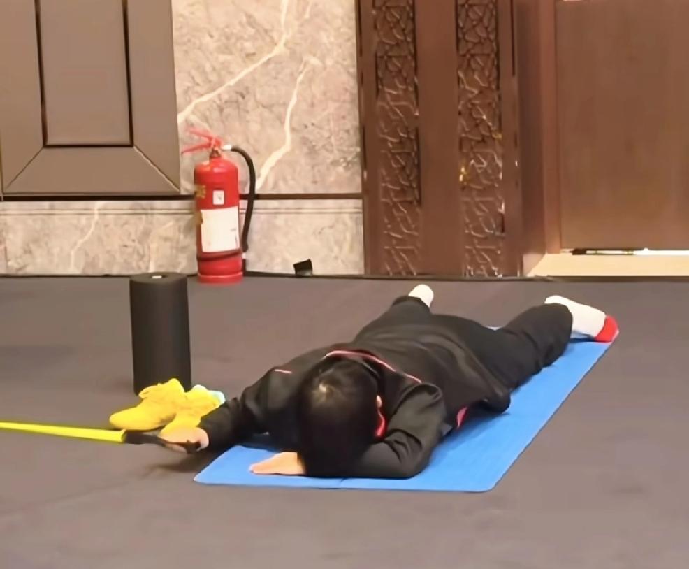 今天训练中的孙颖莎, 蓝色的短袖, 网友说今天是小蓝莎。 大概是下午比赛完莎莎就来了训练场。 早上热身的孙颖莎趴在训练毯上, 有网友说莎莎看上去像睡着了, 想过去给她盖个毯子。 哈哈,别操那么大心了, 孙颖莎再认真热身中。