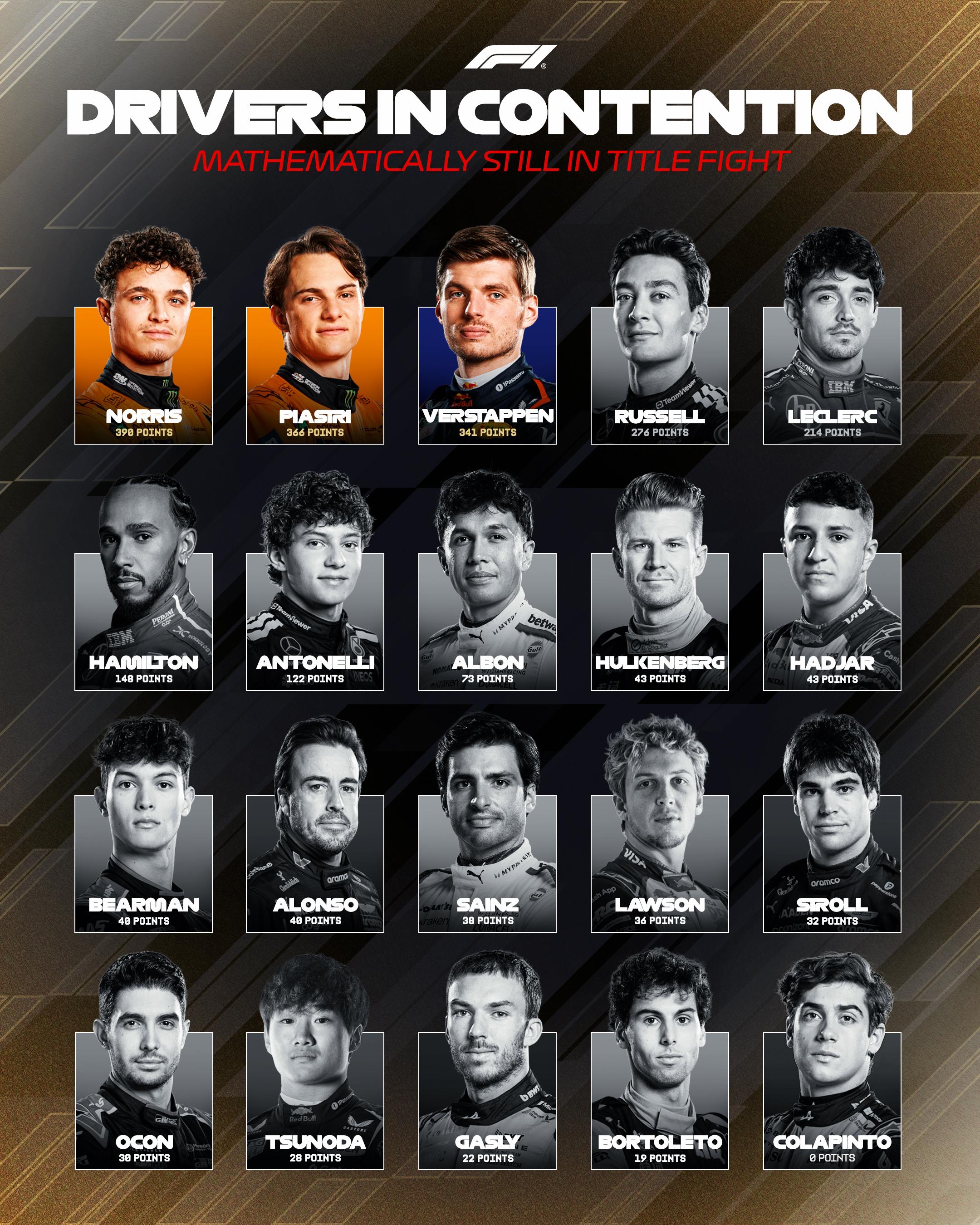 这一头衔的竞争范围正式缩小到了兰多-诺里斯、奥斯卡-皮亚斯特里和马克斯-维斯塔潘的三人组。