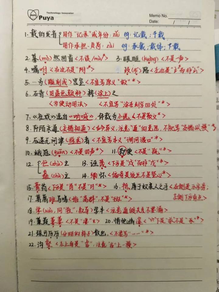 他会用三种不同颜色的笔分别记下相应的内容,比如在上面这份笔记中,黑笔写的是词语或字,红笔写的是需要注意的重点(读音、用法等),蓝笔写的是备注内容。