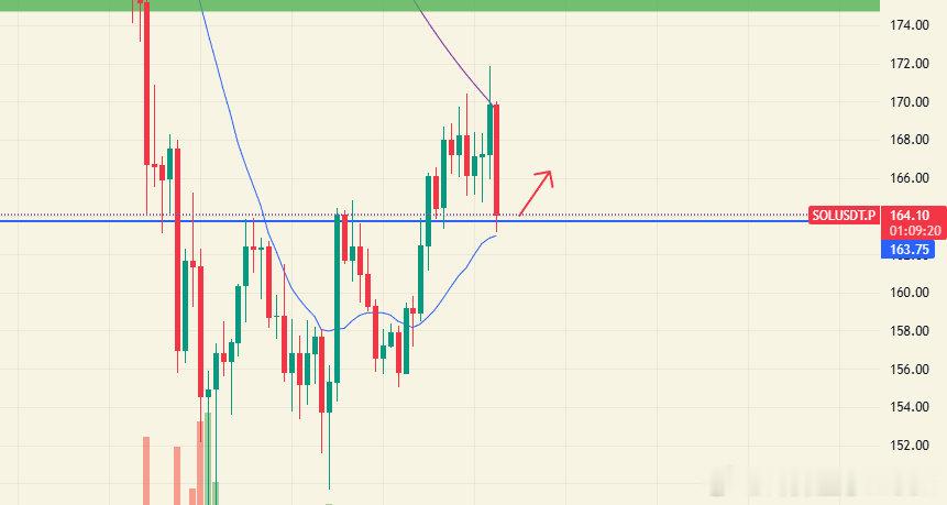 SOL目前1小时回踩支撑,4小时回踩20线支撑163附近,可以看个小反弹,上方压