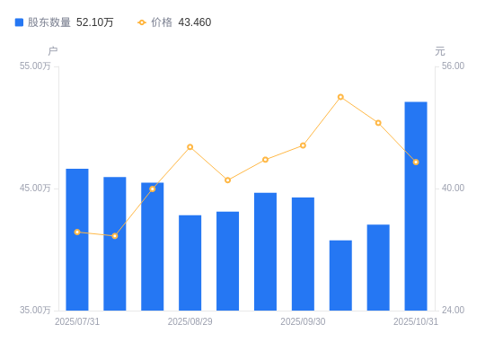 日期A股户数(户)流通A股户均持股数(股)户均持股市值(万元)2025-11-105479837349.4330.952025-10-315210277729.6633.592025-10-204204679578.3046.552025-10-104075249882.5151.392025-09-304425649100.0641.532025-09-194465039019.7839.492025-09-104310139343.9438.392025-08-294280979407.5942.752025-08-204548068855.1235.372025-08-084593128768.2429.62