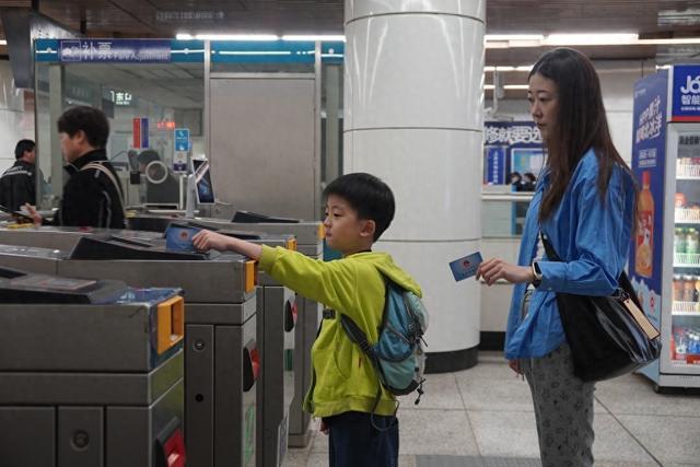 保定市民范芮洁(右)和儿子用社保卡乘坐北京的地铁。保定市人社局供图