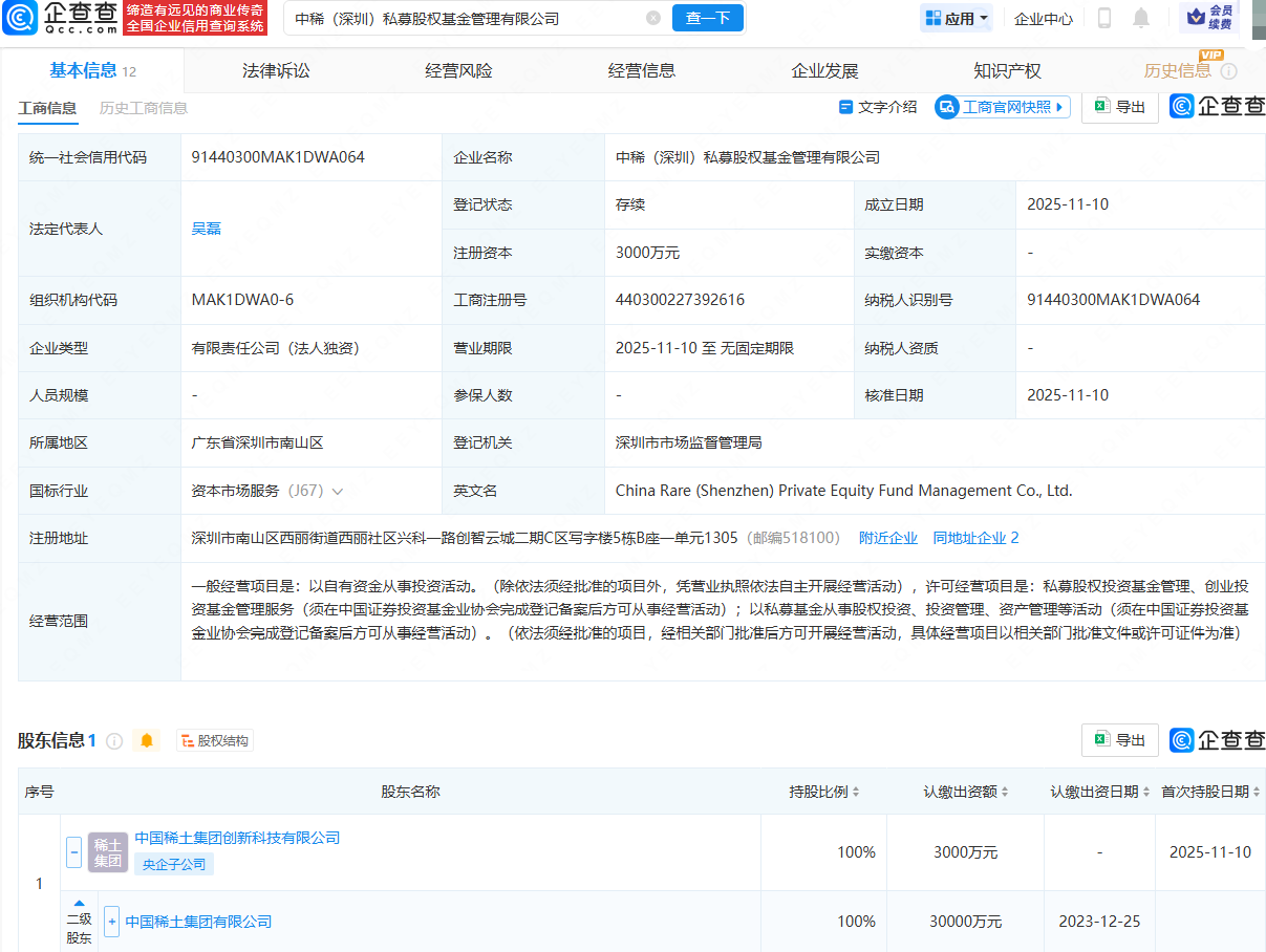 企查查APP显示,近日,中稀(深圳)私募股权基金管理有限公司成立,法定代表人为吴磊,注册资本为3000万元,经营范围包含:以自有资金从事投资活动;私募股权投资基金管理、创业投资基金管理服务等。企查查股权穿透显示,该公司由中国稀土集团有限公司间接全资持股。