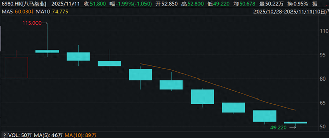 然而涨势未能持续,自第三个交易日起,八马茶业股价连续八个交易日下跌。至11月11日,盘中最低触及49.22港元,跌穿50港元的发行价;收盘报51.8港元,当日下跌1.99%。