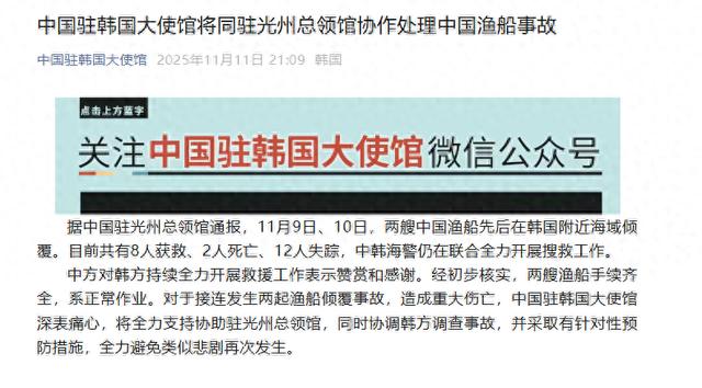 中国网11月11日讯中国驻韩国大使馆11日晚间发布消息称,据中国驻光州总领馆通报,11月9日、10日,两艘中国渔船先后在韩国附近海域倾覆。目前共有8人获救、2人死亡、12人失踪,中韩海警仍在联合全力开展搜救工作。