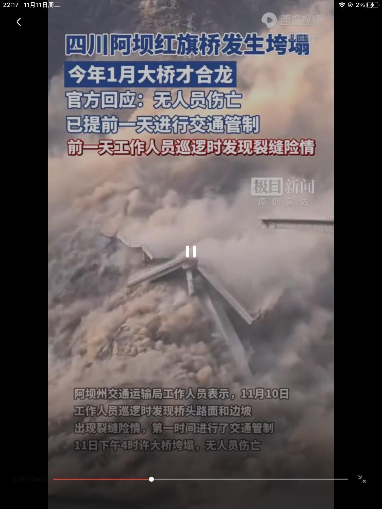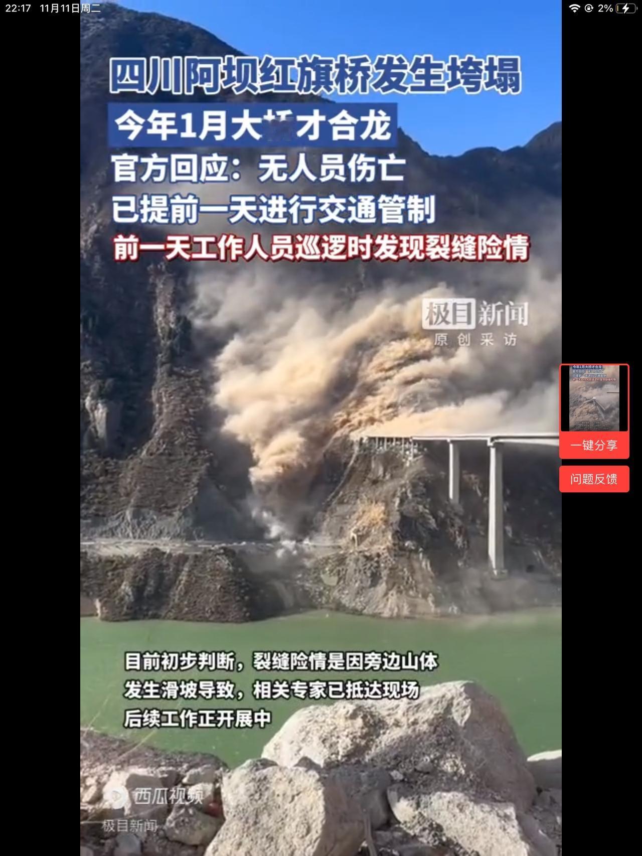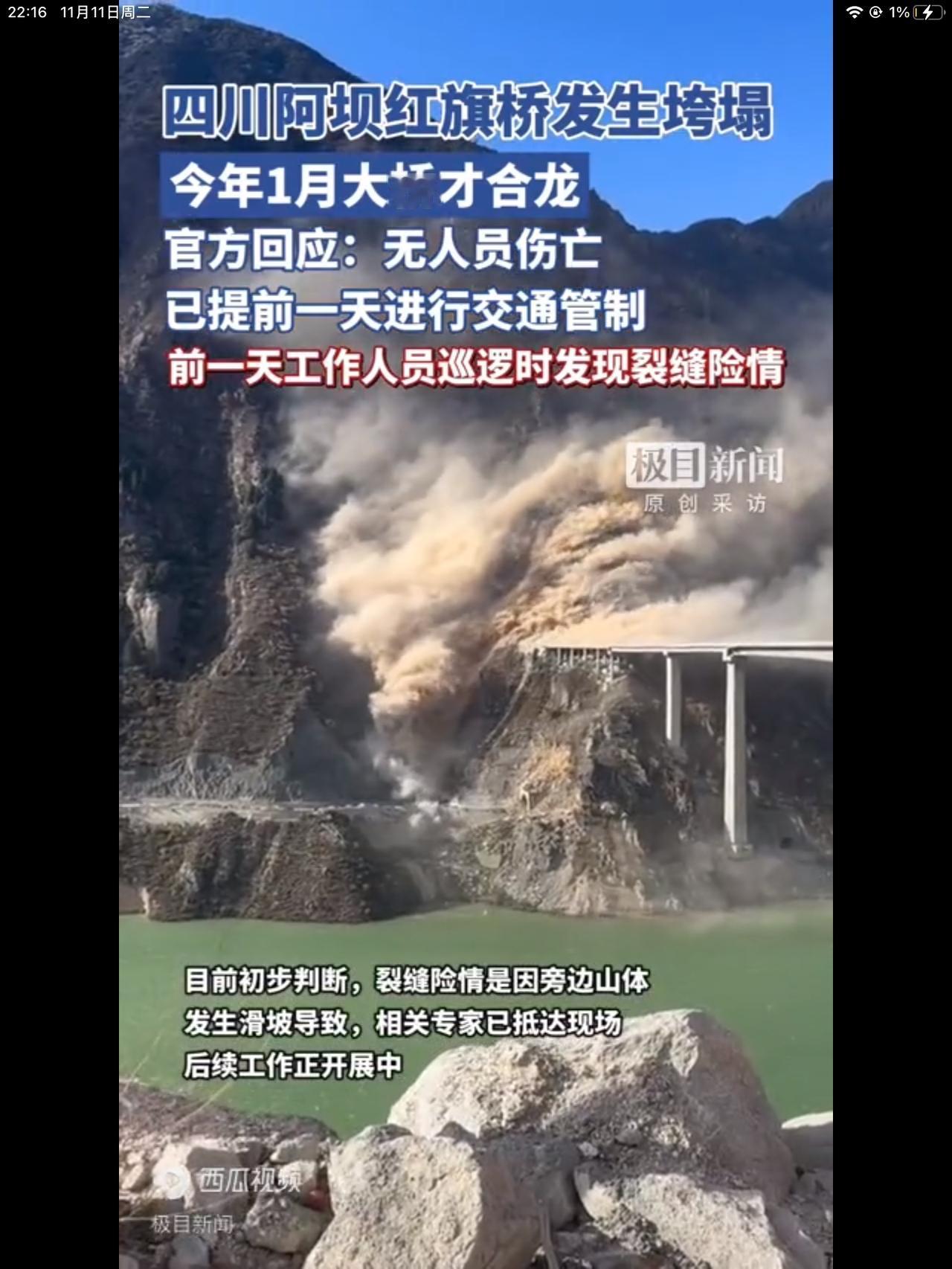 四川阿坝红旗特大桥发生垮塌,今年1月主跨刚合龙,官方:山体滑坡致边坡裂缝,已提前一天交通管制无人员损失。 对头儿还不到一年。这么大的工程。就是说,啊,有工作人员前一天巡逻时候,发现有裂缝,有险情。然后就禁行了。 疑问肯定有,不明了个白了。这质量这么差吗?幸好没有伤亡。啊,屁股还能坐的住。要不然,哼哈,害怕的人有好几个。 豆腐渣,渣的很。没有钢筋,没有骨。