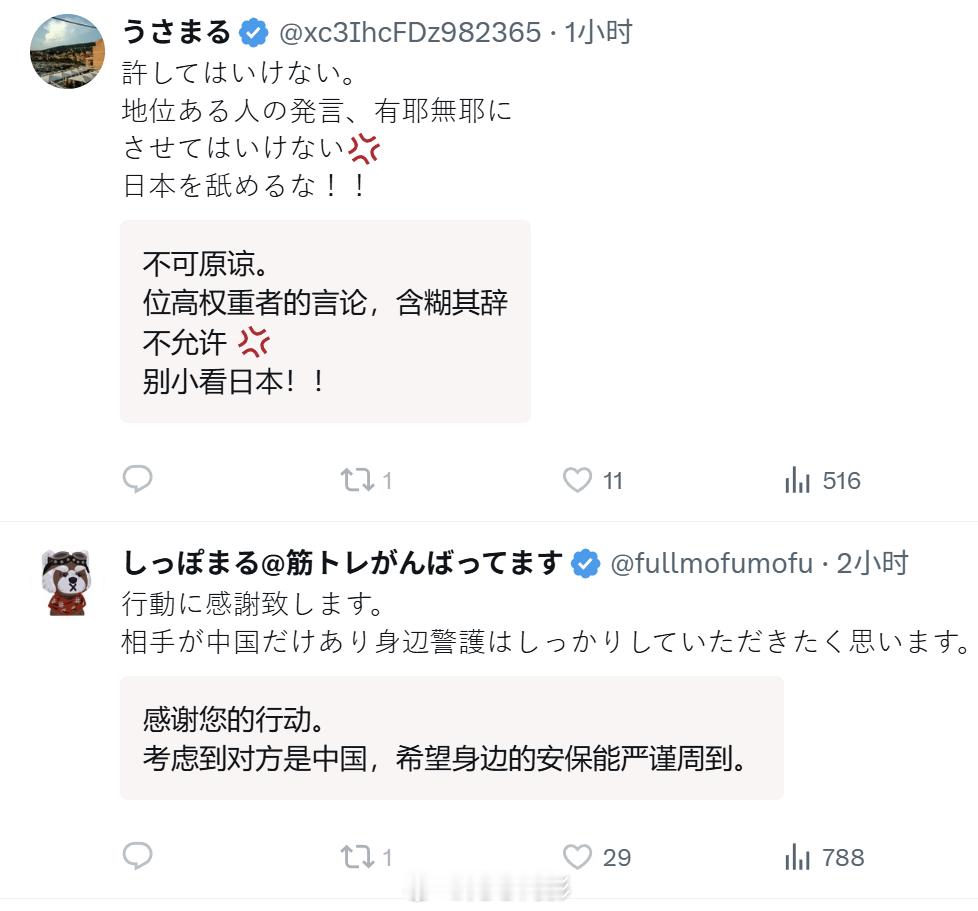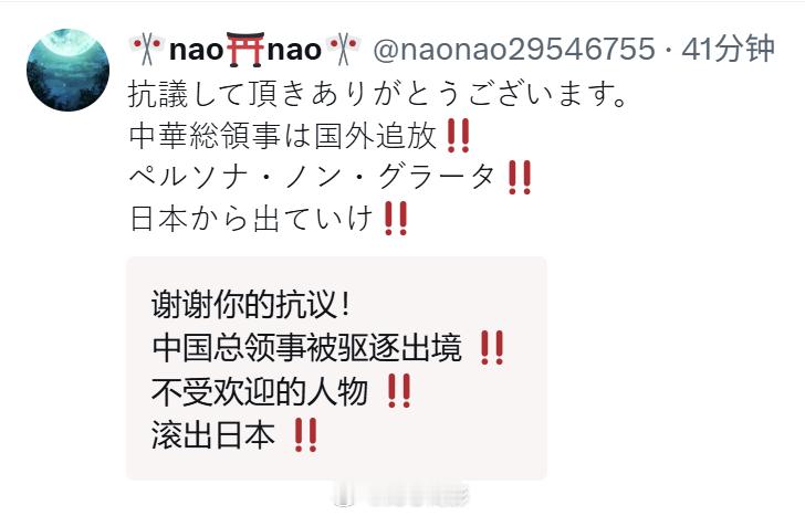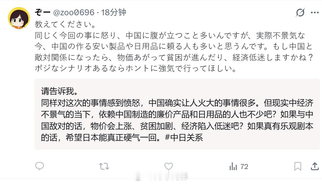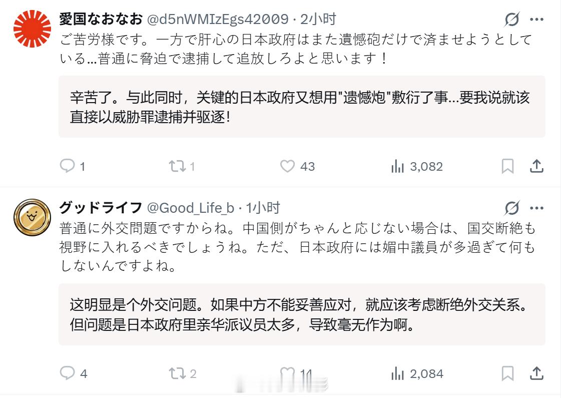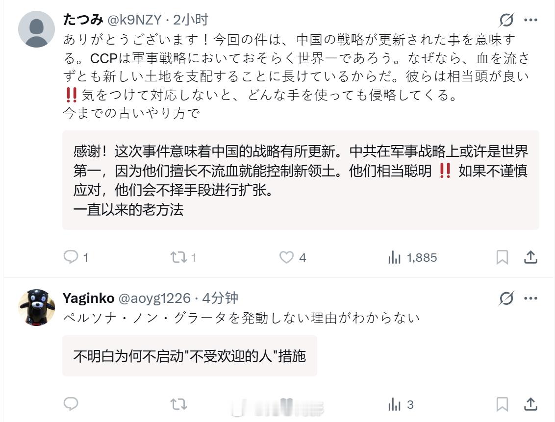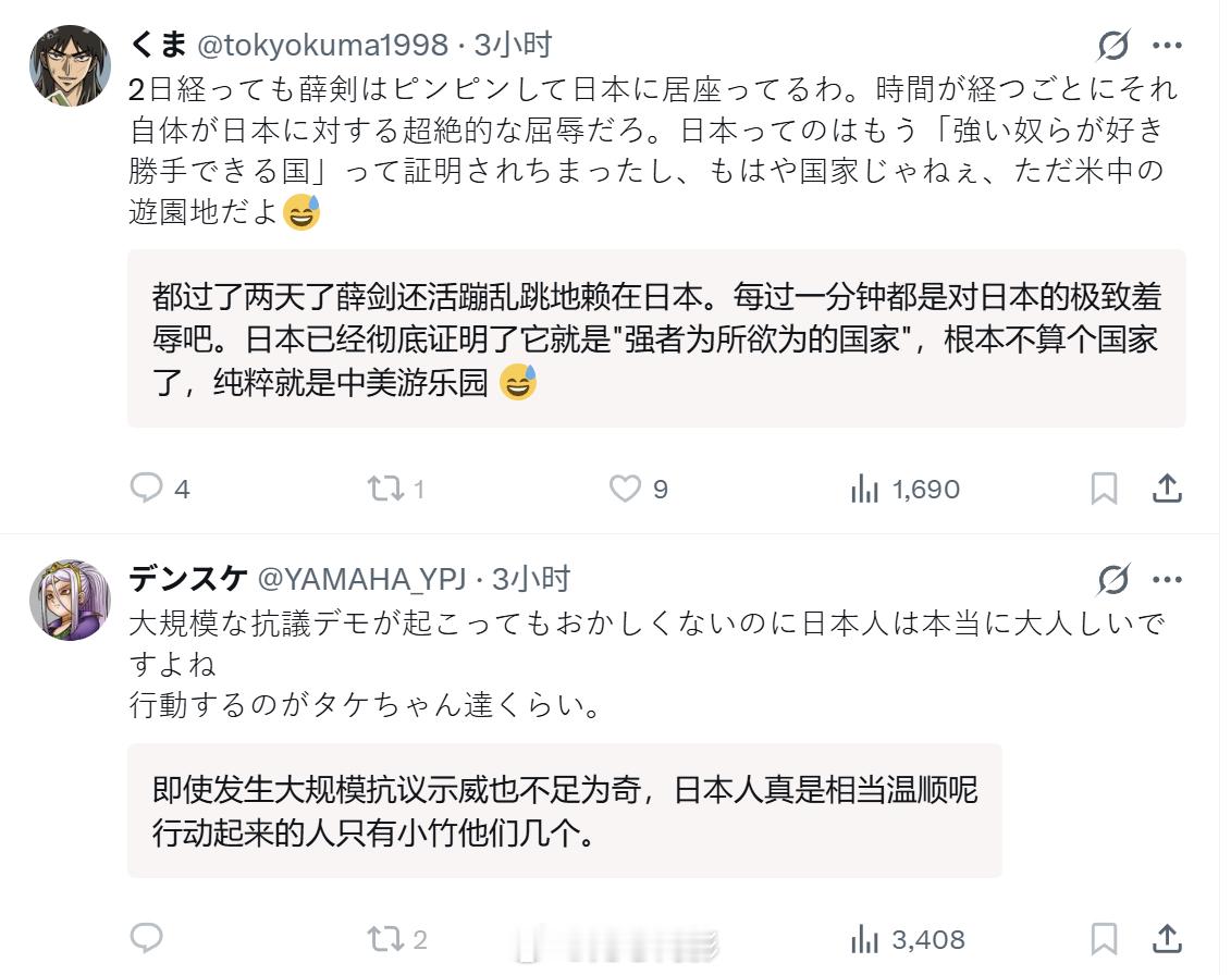 笑死……薛剑总领事帖子是8号晚上发布的,这都几天了,日本小鬼子们这几天闹得声势浩大,又是批判,又是告洋状的,现在还有候补议员跑去我大使馆递交抗议书(顺便贴出银行帐号要人打钱),但评论区还是掩盖不住失望(特别是图5那个)……他们觉得中国领事这么“无理”,怎么就不驱逐呢?高市早苗当局怎么就这么敷衍呢?明明说都要砍你头了,怎么不见政府急一下呢?还有人让这些表演家冷静下,控制下厌华情绪,毕竟日本经济不景气,很多穷人还要靠中国的商品过日子呢。(这里要注意一下,目前日本右翼的叙事就是把中国人描述成欧洲难民潮那种,靠人数占领别国,所以评论区就出现“他们擅长不流血就控制新领土”,现在不少日本人认为中国的领土都这么来的,脑残到你无法想像)