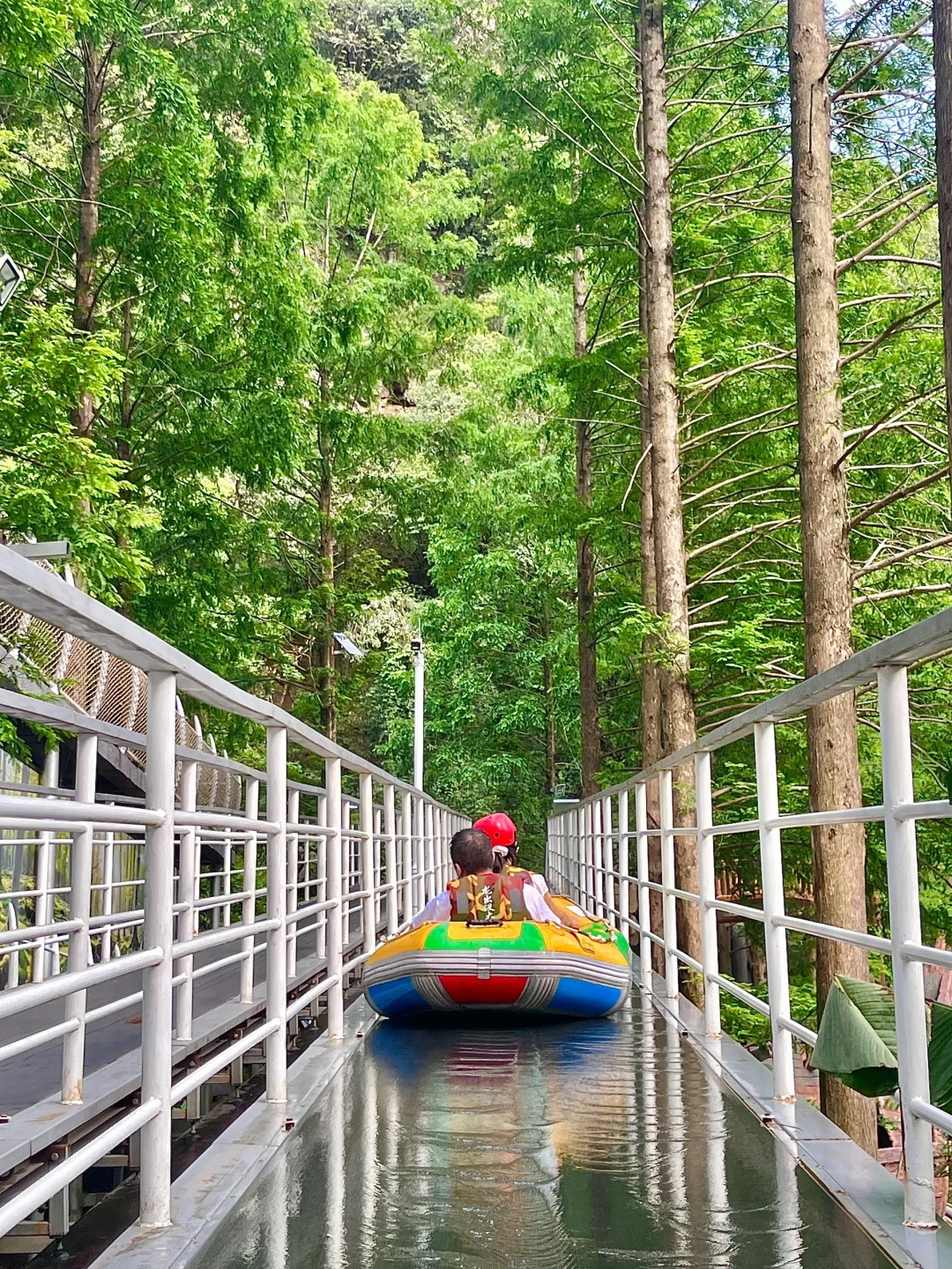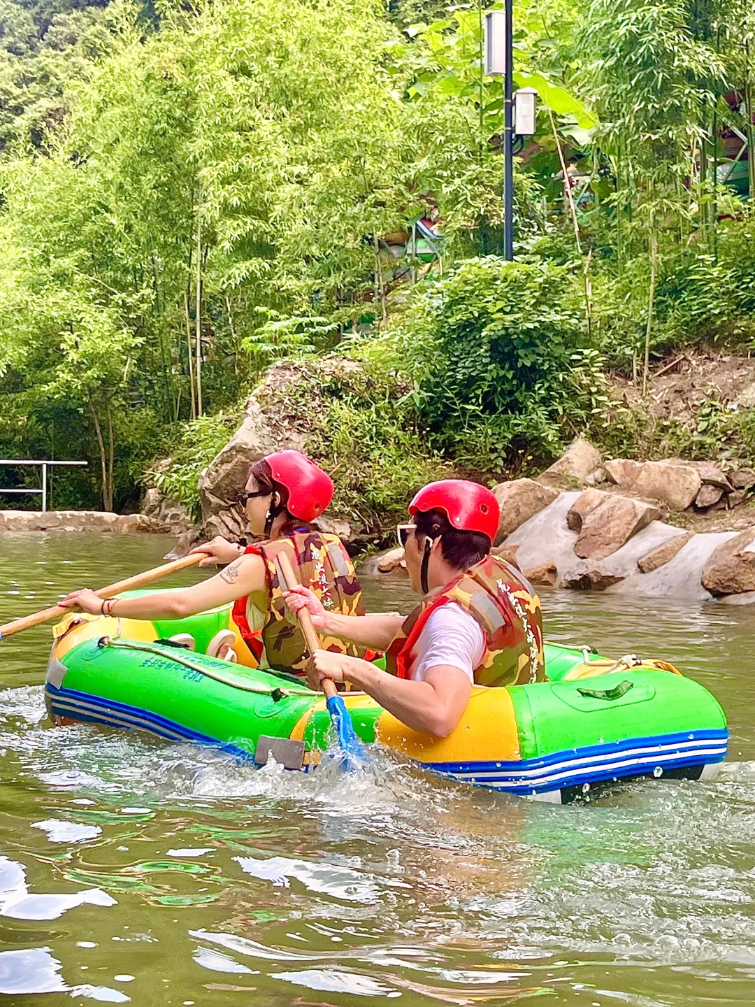 景区配备五点式儿童救生衣,家庭票有优惠。怕晒的选激情漂,关卡刺激但平缓段多;胆大的娃可尝试勇士漂浅水区打水仗