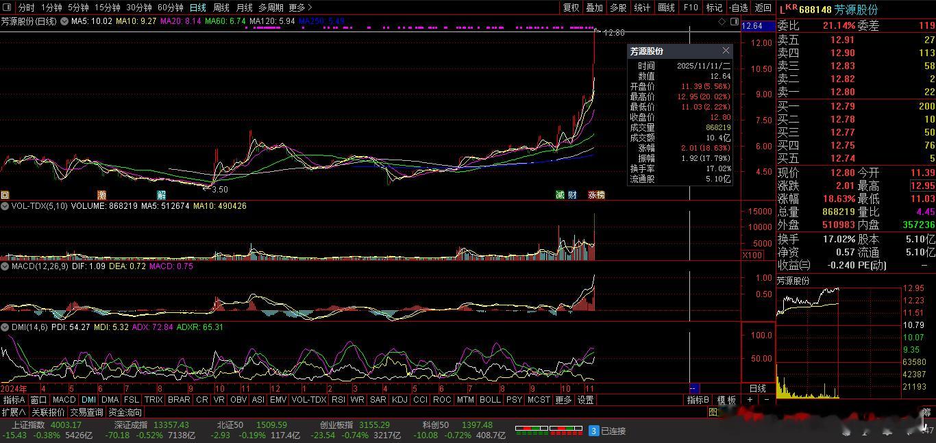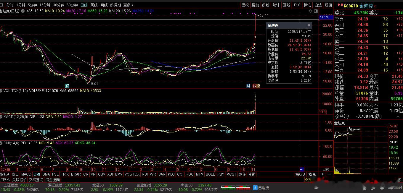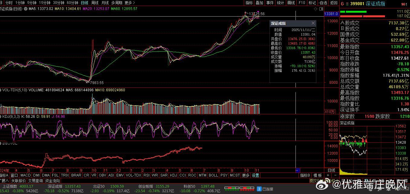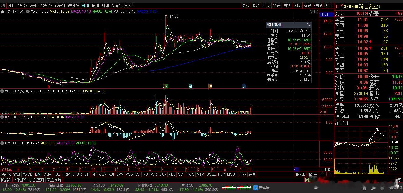 【财富晚茶】午盘透析(11.11):北证跌幅0.19%:燃气反弹航天回调导语:作者系《网易号》优质财经领域创作者。曾经原创作者和知名网易号旅游领域创作者。大跨度行业等的写作,颇受网友喜爱。作品发表于2025.11.11.12:18 优雅端庄晚风。【内容概述】今日股市午评:截止11:30:沪指:贡献1根阳线1阴线。深指:贡献0根阳线2阴线。沪指突破:阻力位:04018点。沪指突破:支撑位:03991点。深指跌破:阻力位:13502点。深指突破:支撑位:13306点。追寻盘面:沪深高开做多杀跌,尾盘震荡触底反弹 。一、透析市场:风口公司,上下起伏920786 骑士乳业 盘中01涨1、突破三年箱顶视野盘面:前期三顶:双底脉冲。2025-11-10 截至11:30:股价报收:11.00元。该股上涨:3.77%。成交总量:274460手,成交金额:2.96亿元。总换手率19.30%,观总市值:22.95亿元。流通市值:15.60亿元。2、牧草奶牛翘楚主营业务:牧草种植-牛场运营-奶牛集约化养殖-优质生鲜乳供应的研产和销售。公司品牌:全产业链乳制品综合供应商和头部企业。3、经营优良企业财报透视:2025-09-30 三季度报:公司营收:9.1353亿 同比增24.01%。公司净利:3909.7136万 同比增281.30%。二、沪深绿盘:多方强势,喜剧股市今天目击:沪深北市:早盘:高开四跌,一涨四跌。尾盘:一跌一涨,中位绿盘。看点之一:沪深两市:股指高开:盘中震荡:杀跌下探。沪指有惊:保4000点。看点之二:二只乌鸦:创科50指:跌幅近1%。看点之三:沪深北市:半日成交:12681亿元。盘面追踪:2924股飘红。三、沪深阴棒:个股强势,赚钱效应沪深追踪:截至午间:市场收盘:沪指跌0.38%报4003.17点,深指跌0.52%,创指跌0.74%,北证50指跌0.19%,沪深北市:合计成交:12681亿元。四、盘面观察:燃气脉冲,航天回落1、板块扫描透析沪深板块:板块走强:燃气、化工、石油、地产等。板块走低:航天、煤炭、保险、券商等。概念活跃:培育钻石、钙钛矿电池、稀土、锂电池等。2、个股涨跌起伏沪深北市:多空遭遇。2924股票上涨,66涨停板。2333股票下跌,3股跌停板。沪深北市:合计成交:12681亿元。午盘视野:沪深高开筹码兑现,尾盘探底游资抢筹。五、沪深涨跌:三甲前茅,安不忘危1、今日涨幅谁家主旋律:天经地义:风口股票涨停板688233 神工股份 688148 芳源股份 688670 金迪克第一、涨幅榜眼排行榜-1:688233 神工股份主营业务:输配电设备产品研产和销售。公司品牌:中国乃至世界半导体硅材料领域的领先者。排行榜-2:688148 芳源股份主营业务:锂电池三元正极材料前驱体-镍电池正极材料研产和销售。公司品牌:国内领先的锂电池NCA正极材料前驱体生产商。排行榜-3:688670 金迪克主营业务:人用疫苗的研产和销售。公司品牌:国际一流水平的中国生物科技公司。第二、综评榜技术看盘-1:688670 金迪克。潜力股票-1:688670 金迪克:国际一流水平的中国生物科技公司。风险股票-1:暂时没有:即无。2、今日跌幅谁家主旋律:摇摇欲坠:弱势股票涨停板300391 *ST长药 300950 德固特 688033 天宜新材跌幅榜-1:300391 *ST长药主营业务:医药制造-通用设备制造-新能源业等研产和销售。公司品牌:亚洲最有影响力的道地药材全产业链供应商。跌幅榜-2:300950 德固特主营业务:节能环保装备-专用定制装备研产和销售。公司品牌:全球节能环保-高端装备引领者。跌幅榜-3:688033 天宜新材主营业务:高铁动车粉末冶金闸片-机车城轨车辆闸片等研产和销售。公司品牌:高铁粉末冶金闸片行业头部企业。六、创作不易:优质网易,财经作者投资投机迷茫之中:给予尽可能有帮助:资本市场风险自负。(优雅端庄晚风《网易号》财经领域创作者和原创作者 违者必究)