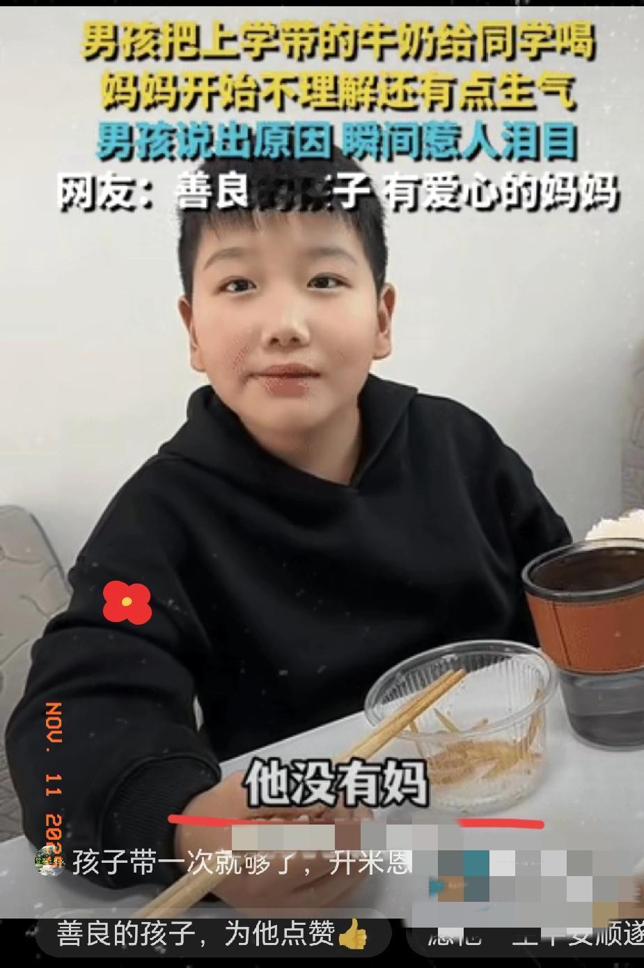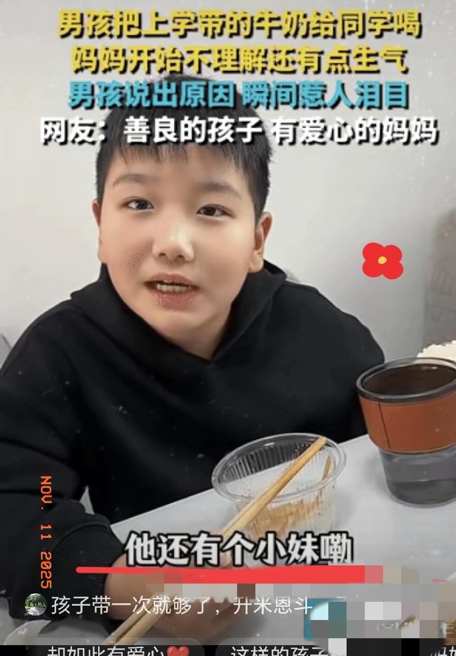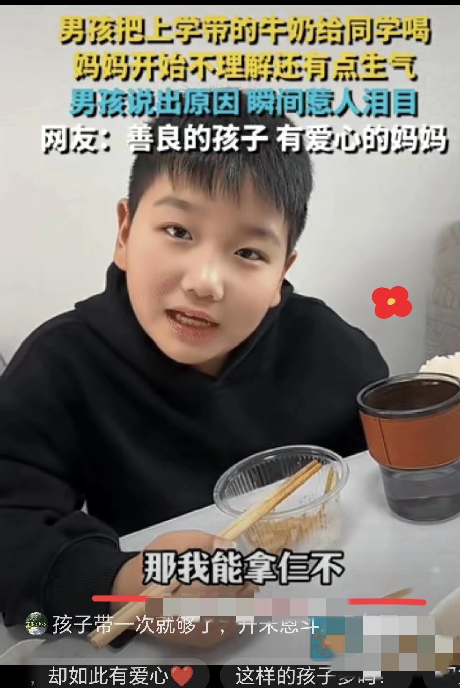 男孩自己吃咸菜馒头,却还总是把上学带的牛奶给同学喝 ,妈妈有点生气的跟孩子说不要再把牛奶给别人了 。万万没想到 ,男孩的回答瞬间让人心里酸酸的 。 放学回家饭桌上,妈妈带着火气问他是不是又把牛奶给了同学,男孩懵懂反问“你咋知道”,妈妈忍不住吐槽“人家妈不会自己买吗”。可孩子一句轻飘飘的“他没有妈”,瞬间让妈妈的怒气没了踪影。妈妈连忙说以后带两个一人一个,没想到男孩却怯生生问能不能带三个,原来同学拿到牛奶从不舍得喝,都会带回家留给妹妹。 这一幕真的看哭了,小小年纪吃着最简单的饭菜,心里却装着别人的难处。善良从不是拥有多少才去分享,而是明明自己也不富裕,却依然愿意倾其所有。比起成绩和物质,这种刻在骨子里的共情力和同理心,才是父母能给孩子最好的教育。 现在太多人习惯了精致的利己,这个男孩的举动反而像一束光,照亮了最纯粹的善意。你家孩子做过哪些让你意外又暖心的事?评论区聊聊~