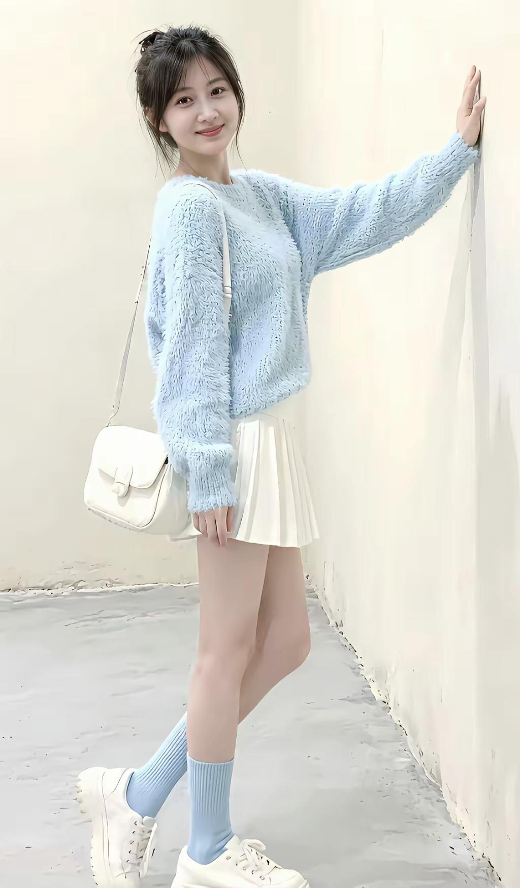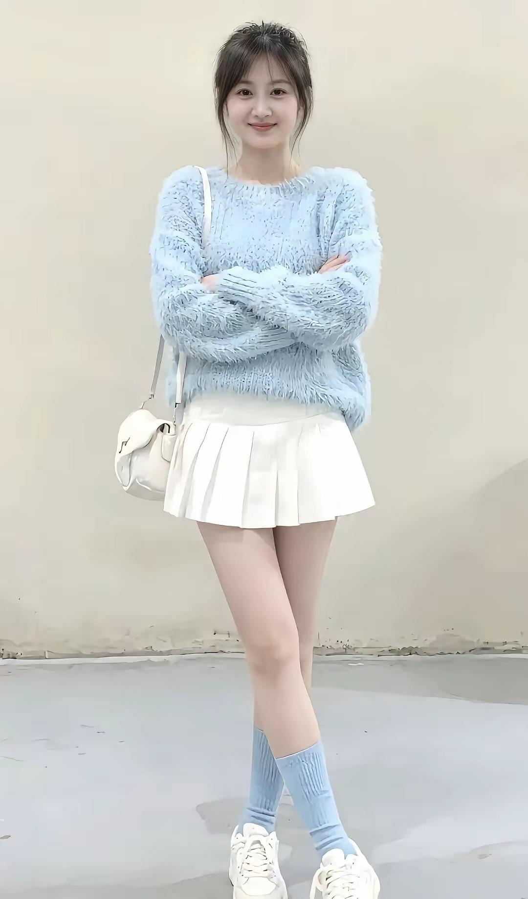 清新少女风穿搭,浅蓝色毛衣+白色短裙,元气满满!💕什么样的丝袜,能搭配得时尚不