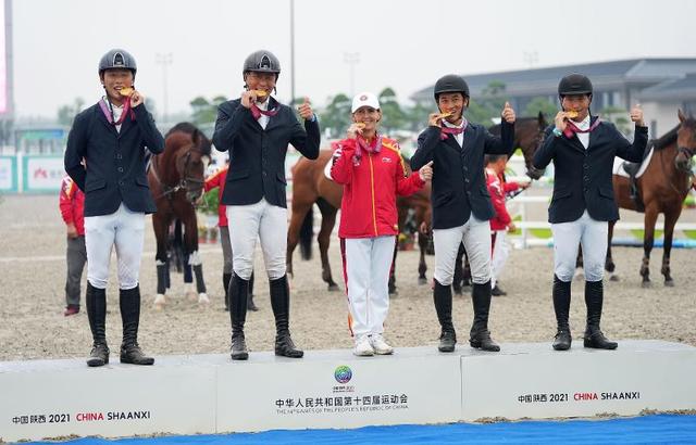 2021年9月23日,冠军上海队选手沈沉达、张滨、教练塔伦,选手杨华、许新(从左至右)在颁奖仪式上庆祝。十五运,老将张滨是第九次征战全运会。新华社发