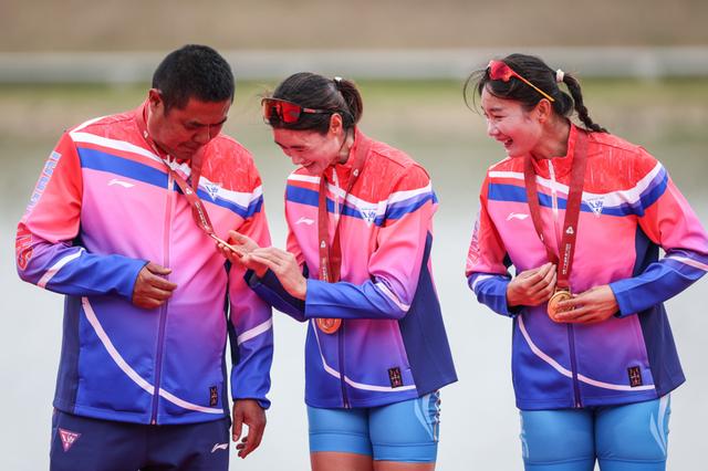 11月11日,冠军上海队选手陈云霞(中)/张灵(右)和教练在颁奖仪式上。当日,第十五届全国运动会赛艇项目女子双人双桨决赛在广州举行。新华社记者潘昱龙摄