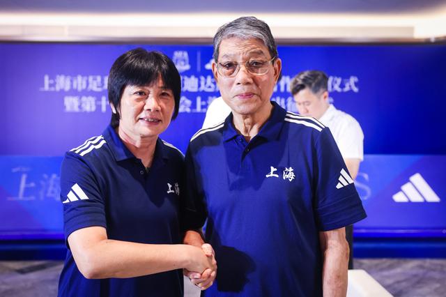 上海全运女足主教练水庆霞、上海全运男足U20队总教练徐根宝握手。
