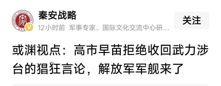 高市早苗拒绝收回武力涉台的猖狂言论,解放军军舰来了!高市早苗这是彻底把军国主义那一套搬出来了啊!11月7日她大放厥词,说中国对台采取行动,日本自卫队可能武力介入,还让做好最坏准备。11月10日被质问时,她还拒不收回这番猖狂言论,嚣张气焰简直要冲破天。 她这话一出,中国驻大阪领事直接开怼,称敢插手台海就“斩断肮脏头颅”。日本那边还装无辜,一群人跳脚举报中国外交官发言。岛内名嘴也愤怒批判。现在解放军军舰来了,这就是对高市早苗之流的强硬回应,日本最好识趣点,别在台海问题上玩火自焚。