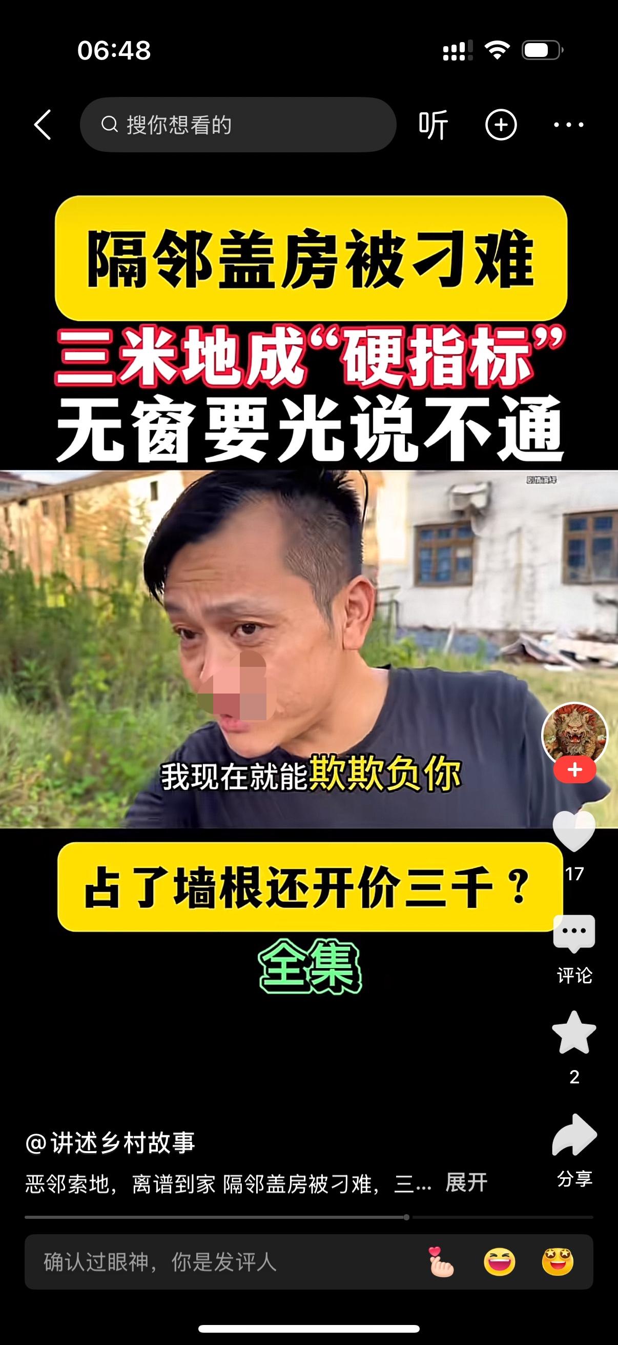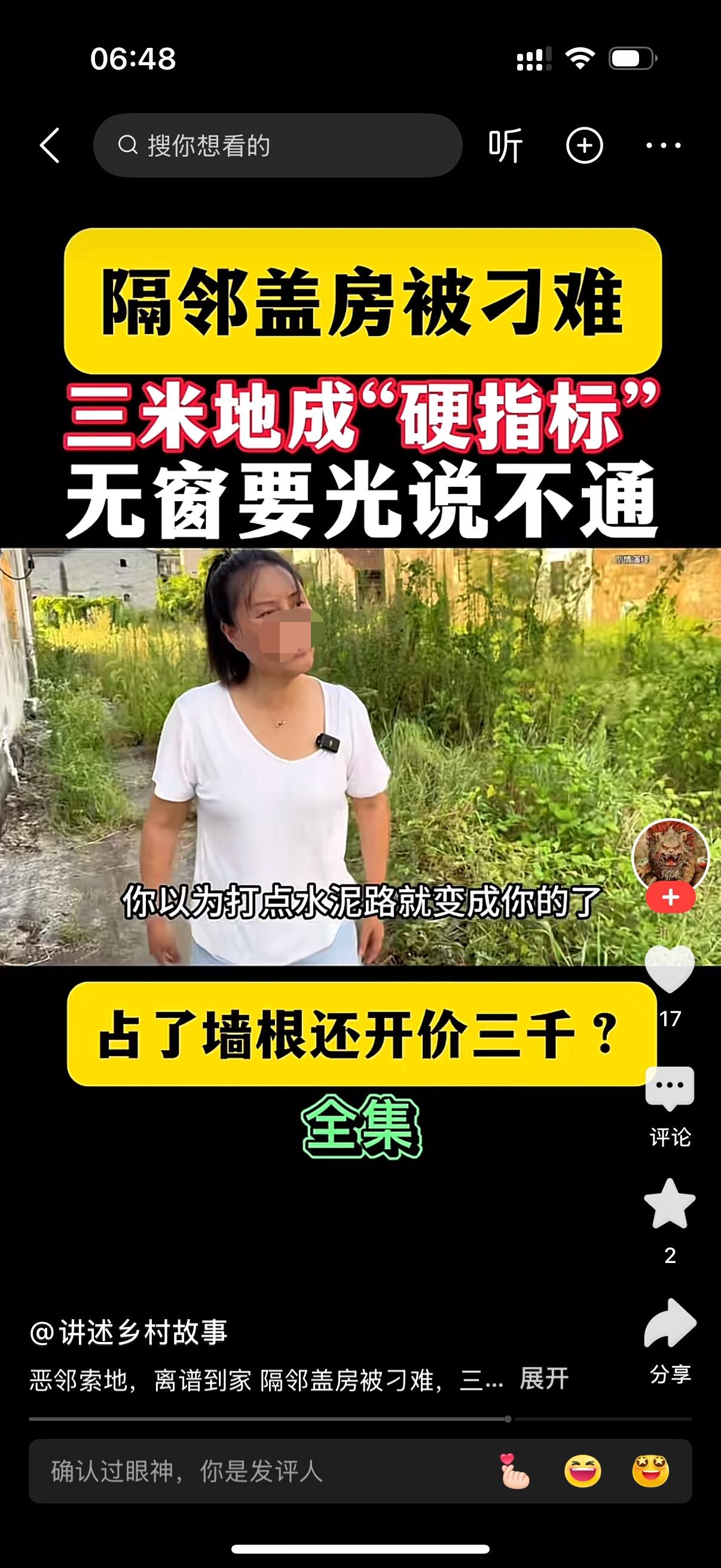 女人要建房子,邻居说会挡住窗户的光线,让她留出三米,否则不让建。女人不同意,因为老房子就是墙挨墙靠壁的。邻居在女人的宅基地上弄了一片水泥地。女人说这是欺负自己。邻居说,对,就是欺负你怎么了?女人心从悲来,就是因为自己的男人软弱,邻居们就逮着自己欺负。
