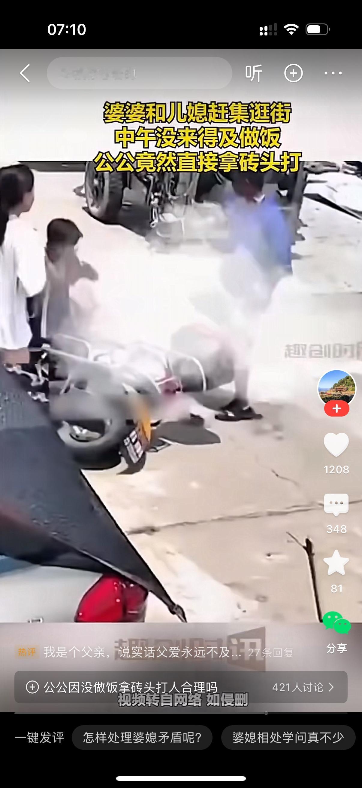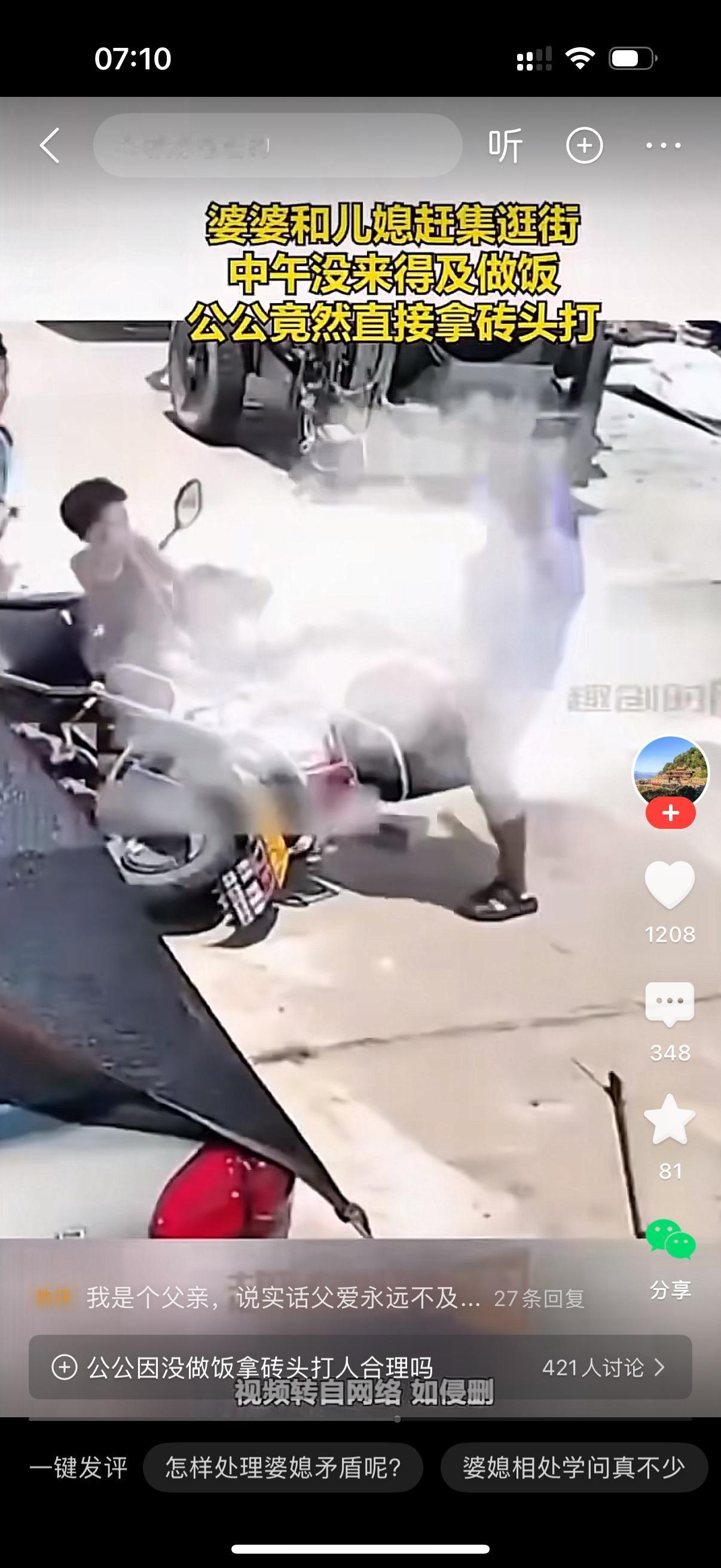 婆婆正坐着媳妇的摩托车去赶集逛街。公公搬起一块砖头就开始打婆婆。婆婆吓得瘫坐在地上,公公过来就是一脚。一脚还不够,接着又是一脚。媳妇惊问,到底怎么回事吗?公公怒气冲冲,我做完工地回来吃饭,这婆娘连中午饭都不做,还跑去外面闲逛。我不揍她? 哎,真是悲哀,相互之间没有体谅和爱。