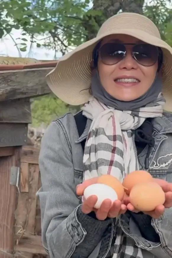 张曼玉分享日常生活,现住在法国波尔多。 自己养鸡,种菜。检到鸡刚下的蛋,非常开心。 现在的她过得很幸福,生活很舒适。 素颜出镜的张曼玉,已经60岁的她,还这么年轻,皮肤紧致,没有松弛,连皱纹都没有。