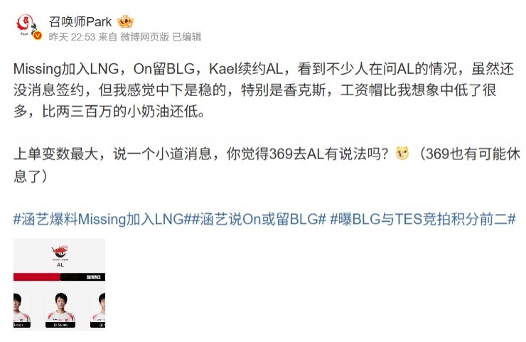 Missing加入LNG,On留BLG,Kael续约AL,看到不少人在问AL的情况,虽然还没消息签约,但我感觉中下是稳的,特别是香克斯,工资帽比我想象中低了很多,比两三百万的小奶油还低。