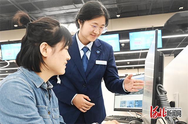 10月31日,雄安新区政务服务中心,工作人员(右)协助办事群众通过线上智能客服“雄小智”办理业务。河北日报记者刘光昱摄