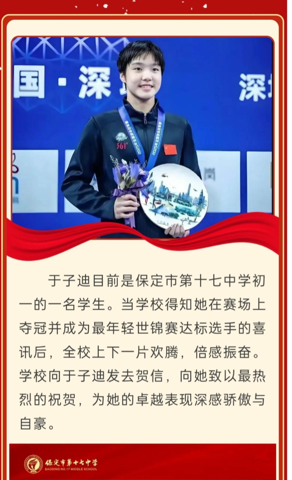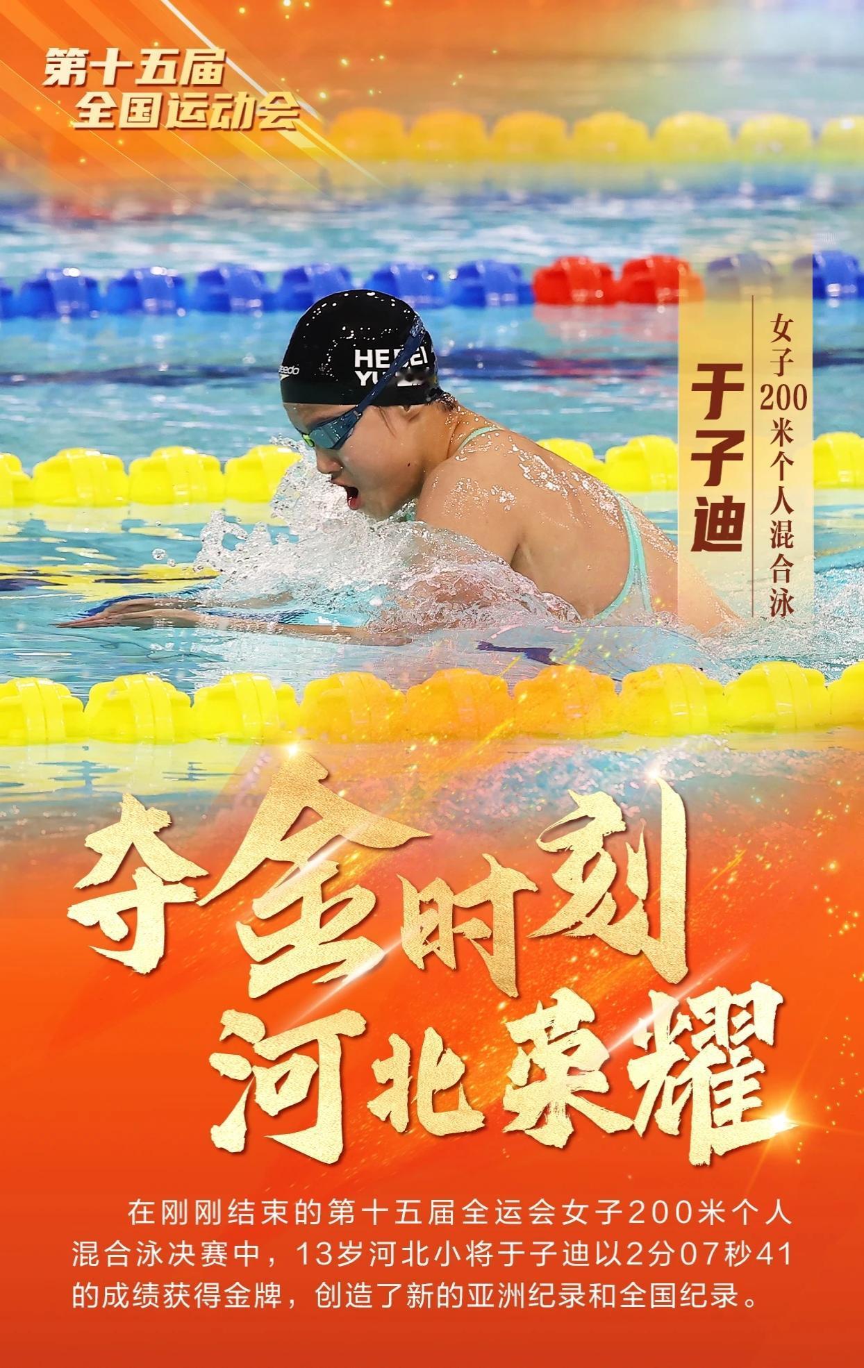 振奋人心!保定“小孩姐”于子迪打破亚洲记录! 11月11日,第十五届全运会女子200米个人混合泳决赛中,13岁河北保定小将于子迪以2分07秒41的成绩获得金牌,创造了新的亚洲纪录和全国纪录。于子迪目前是保定十七中的一名学生,被称为“游泳天才”,多次在世界比赛中展露头角。泳坛新星于子迪 保定是全国奥运冠军之城,走出过奥运冠军郭晶晶、钱红、庞伟、李冰洁等。 本届全运会中,目前河北夺得4枚金牌🥇,三枚均由保定籍运动员摘的,分别是游泳冠军李冰洁、柔道薛紫阳,游泳于子迪。 同时,河北省五超联赛正在如火如荼进行,保定连赢13场,稳居积分榜第一名。 保定有着浓厚的体育氛围,保定人民热爱体育运动。各大公园广场随处可见锻炼的人们。保定马拉松更被称为马拉松氛围天花板,有着“南无锡北保马”的美称。加油,大保定,继续创造辉煌吧!