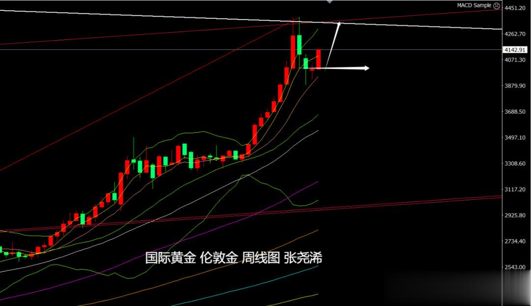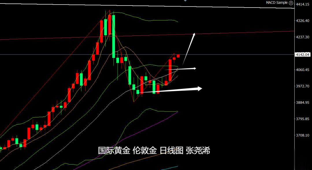 但上周未能进一步跌破10周均线支撑,并收取止跌形态,暗示的本周有止跌反弹重回5周均线上方转强再攀升的倾向的得到验证;布林带也再度向上延伸,5-10周均线也转为支撑,目前将继续维持低多操作,待上看4340美元或更高位置。