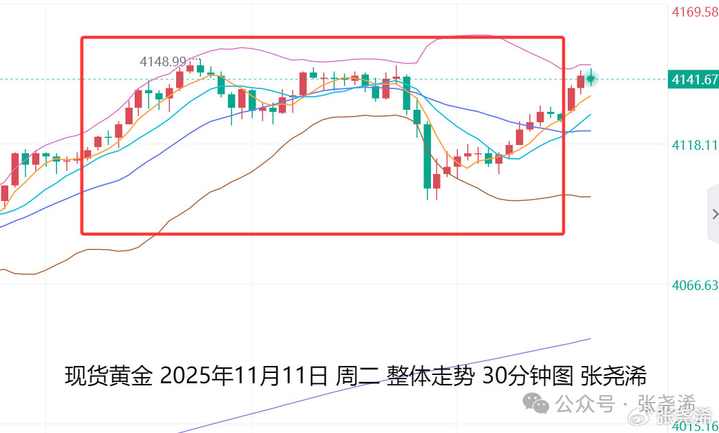 上交易日周二(11月11日):国际黄金震荡收涨,虽有一定的反弹见顶预期,但仍在中轨等均线上方,多头占据优势,基本面上也无明显利空因素,故此,短期仍将继续维持看涨反弹,等待触及4250美元附近。