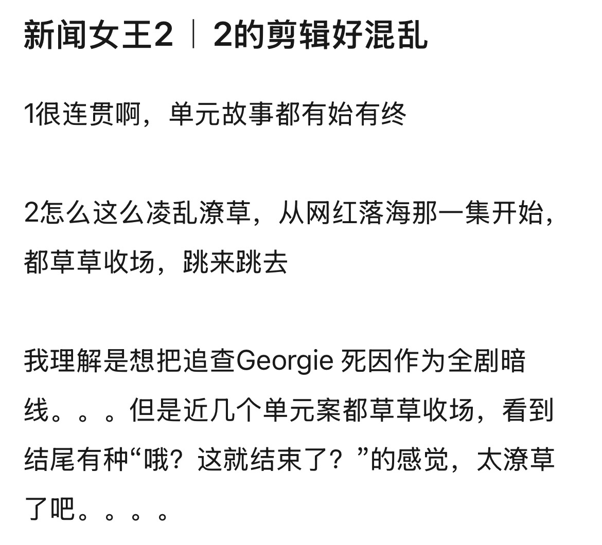 这几集剪辑都没看懂,案件还没完就跳下一个剧情了,都没有收尾,后面还会有交代吗?