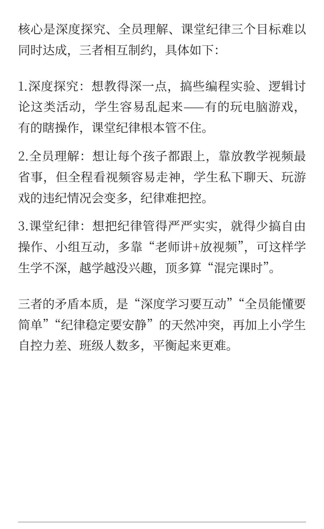 小学信息科技教学“不可能三角” 最近主要时间都在学校里,一腔热情有点儿消耗的差不多了,一节课很难上的让自己满意,总结起来就是以下几点: 1. 深度探究:想教得深一点,搞些编程实验、逻辑讨论这类活动,学生容易乱起来——有的玩电脑游戏,有的瞎操作,课堂纪律根本管不住。 2. 全员理解:想让每个孩子都跟上,靠放教学视频最省事,但全程看视频容易走神,学生私下聊天、玩游戏的违纪情况会变多,纪律难把控。 3. 课堂纪律:想把纪律管得严严实实,就得少搞自由操作、小组互动,多靠“老师讲+放视频”,可这样学生学不深,越学越没兴趣,顶多算“混完课时”。 三者的矛盾本质,是“深度学习要互动”“全员能懂要简单”“纪律稳定要安静”的天然冲突,再加上小学生自控力差、班级人数多,平衡起来更难。