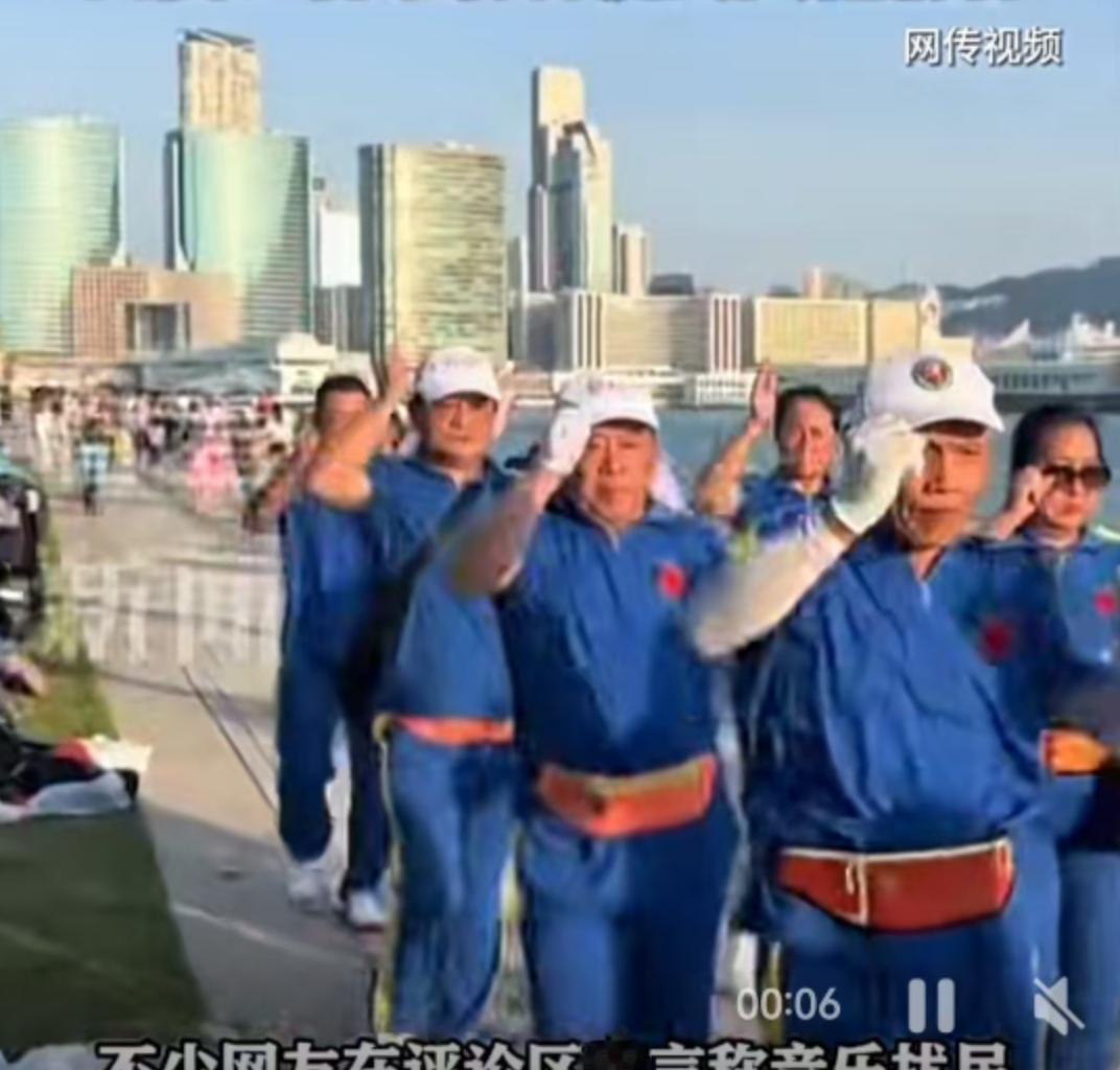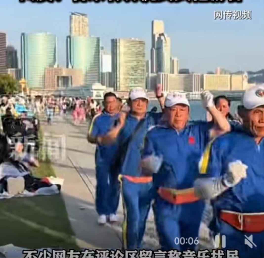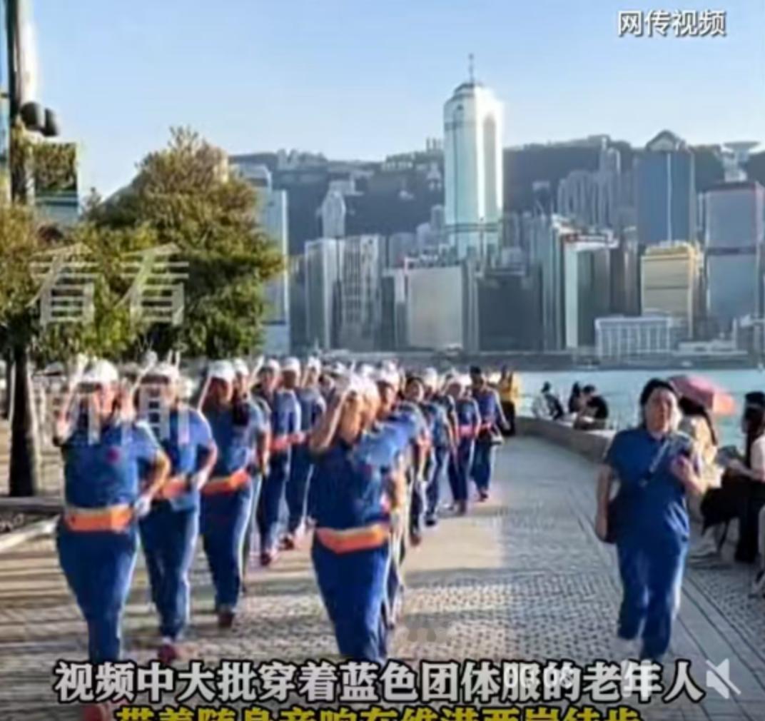 香港维多利亚港的晨光里,一群身着蓝色队服的老年人正沿着海岸线快步前行,随身音响播