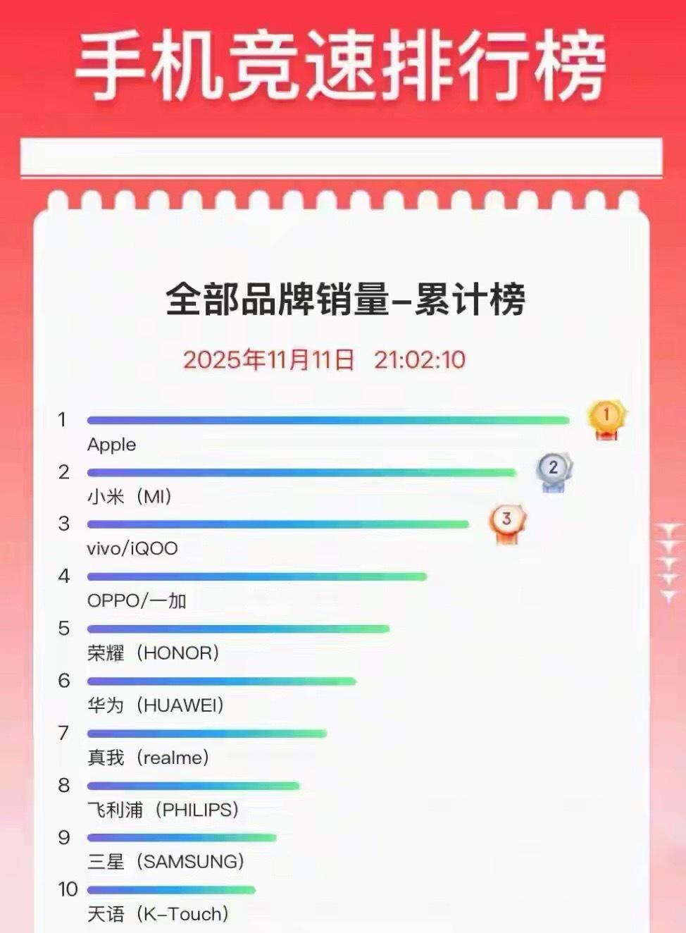 今年双十一手机品类,苹果成为大赢家,iPhone 17系列包揽前三,小米排在第二。前十名当中有5部苹果手机。国产手机上榜的基本上都是千元机,比如荣耀X70、红米Turbo 4 Pro红米K80,超过2000的机型只有红米K80至尊版排在第十位。为什么大家都不买国产高端手机了呢?