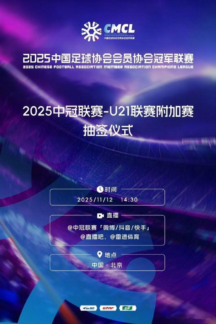 直播吧11月12日讯2025年11月12日下午14:30,2025中冠联赛-U21联赛附加赛抽签仪式将在北京举办。本次抽签,将决定附加赛两回合比赛的主客场顺序,比赛的胜者也将获得2026赛季中乙联赛的最后一个准入资格。