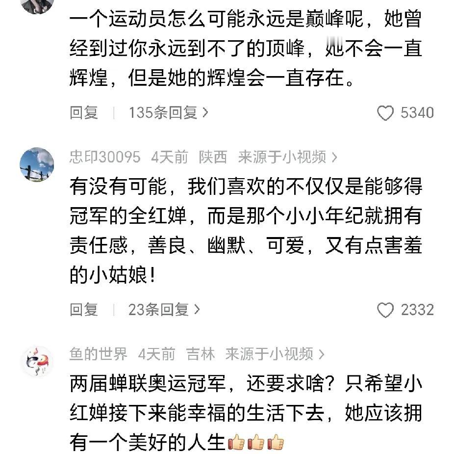 11月10日,全红婵发文:对错都是我的脚印,网友喊话:我们喜欢的不仅仅是能够得冠军的全红婵,而是那个小小年纪就拥有责任感,善良、幽默、可爱,又有点害羞的小姑娘! 一个运动员怎么可能永远是巅峰呢,她曾经到过你永远到不了的顶峰,她不会一直辉煌,但是她的辉煌会一直存在,不管未来如何,希望婵宝做好自己就行,我们永远喜欢她。