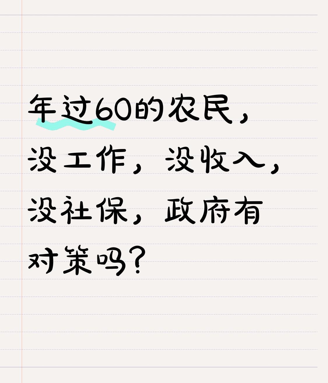 年过60的农民没工作、没收入、没社保,政府是有对策的。 从法律规定来看,虽然《社会保险法》要求累计缴费满十五年才能领养老金,但《老年人权益保障法》要求救助经济困难老人。没社保的农民可以申请基本生活救助,准备好身份证明、家庭收入证明等材料,去当地政府相关部门申请最低生活保障金,审核通过就能按月领钱。 还能参加或补缴城乡居民养老保险,带身份证、户口本等材料到社保经办机构咨询办理。缴费不足15年,60岁后可一次性补齐,之后按月领养老金。要是失地农民,还能申请政府补助,准备失地证明等材料按政策申请。